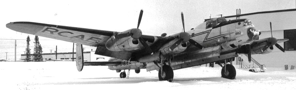 KB882 returned to Canada with No. 428 Squadron, coded NA-R, with ”Rabbit Stew” painted on her nose.  KB882 was one of the few aircraft with nose art.  The crew that flew her back to Canada included Pilot (P) F/L A.L.Ross DFC, DFM, Navigator (N) F/O K.R.Fee DFC, Wireless/Observer (W/O) F/L. Aicken, Bomb Aimer (B/A) F/O E.K.Bergy, Flight Engineer (F/E) F/O R. Loveday, Air Gunner (AG) F/O Dan Ferguson, and (AG) F/O Bill Watson.  KB882 then went into long term storage in Alberta. In Oct 1952 she was brought out of storage, designated as a Mk. 10MR (Maritime Reconnaissance) and flown to RCAF Station Comox, British Columbia.  KB882 was ferried to A.V. Roe (Canada) for a major overhaul and was modified to the Mk. 10P (Photographic) configuration.  The most noticeable alteration was the addition of a 40-inch extension to the nose section. KB882 was the second aircraft to be converted to Mk. 10P.  She was issued to No. 408 (P) Squadron, coded MN882, at RCAF Station Rockcliffe, Ontario, as part of Air Transport Command.