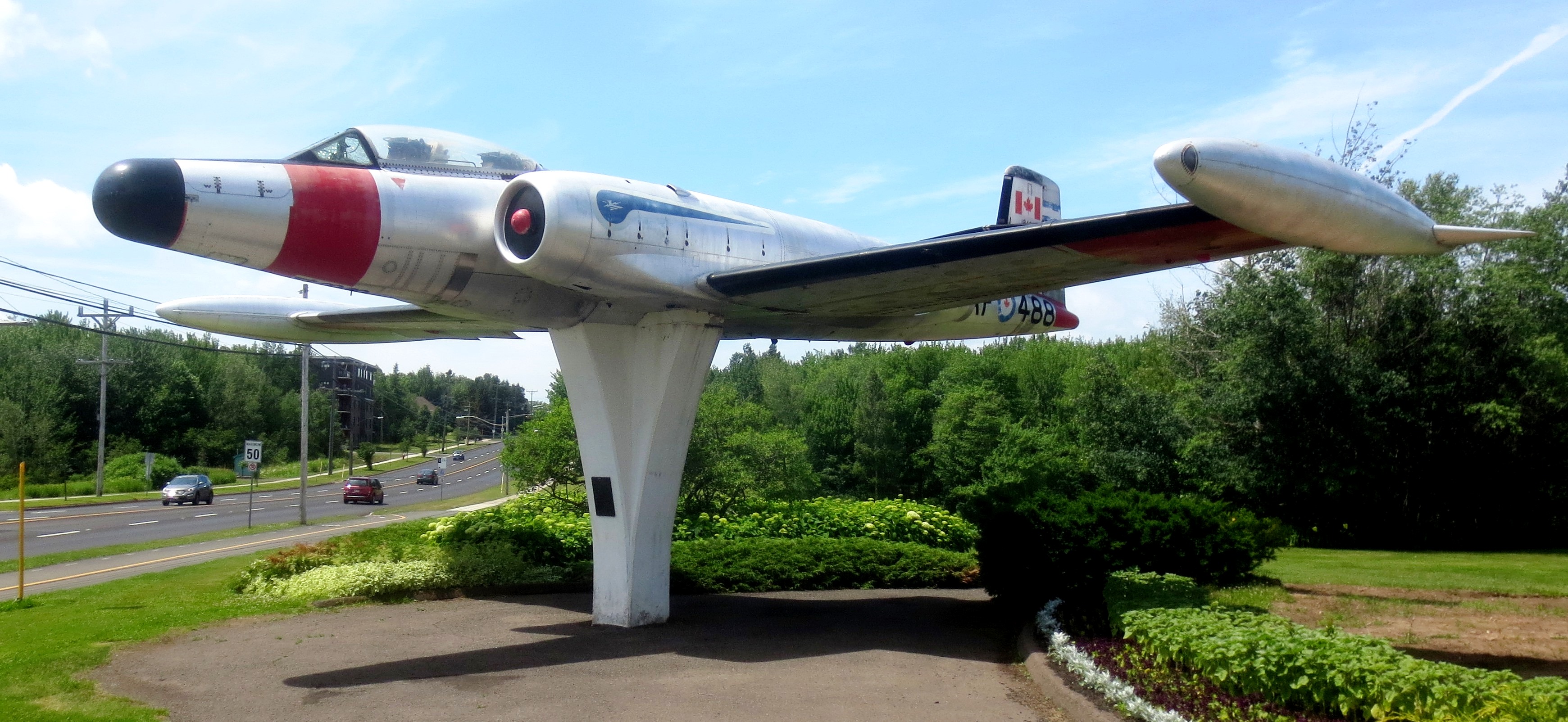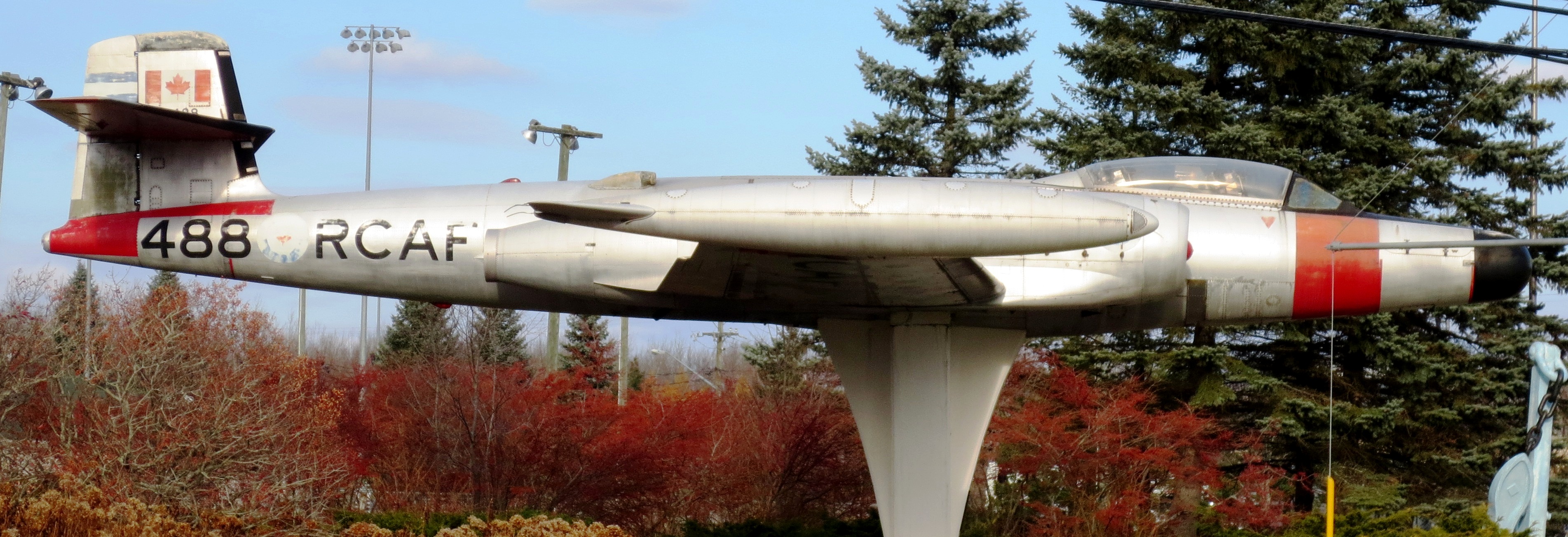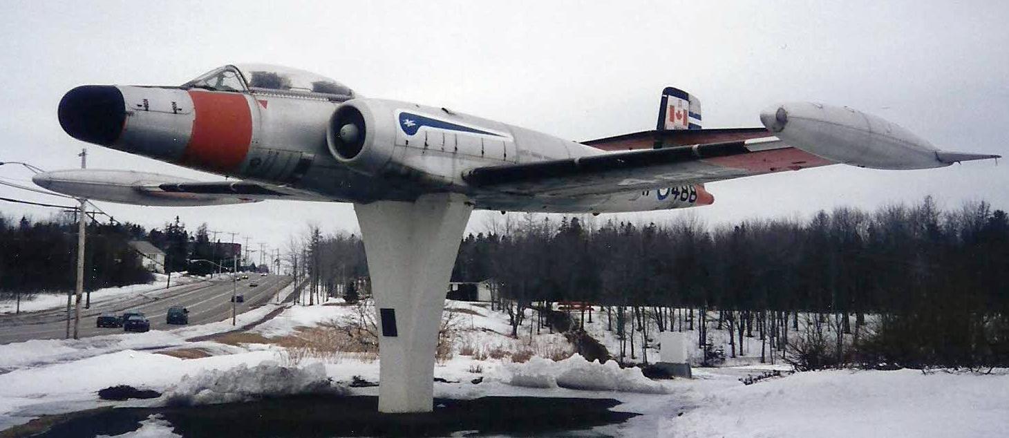 Once upon a time we had Canadair F-86 Sabre Mk. 5 (Serial No. 23355) in Golden Hawks colours mounted on a pylon down the street from where I lived.  The base closed, and the aircraft was moved to Nova Scotia.  23355 is now on display inside the Atlantic Canada Aviation Museum near Halifax Stanfield International Airport.