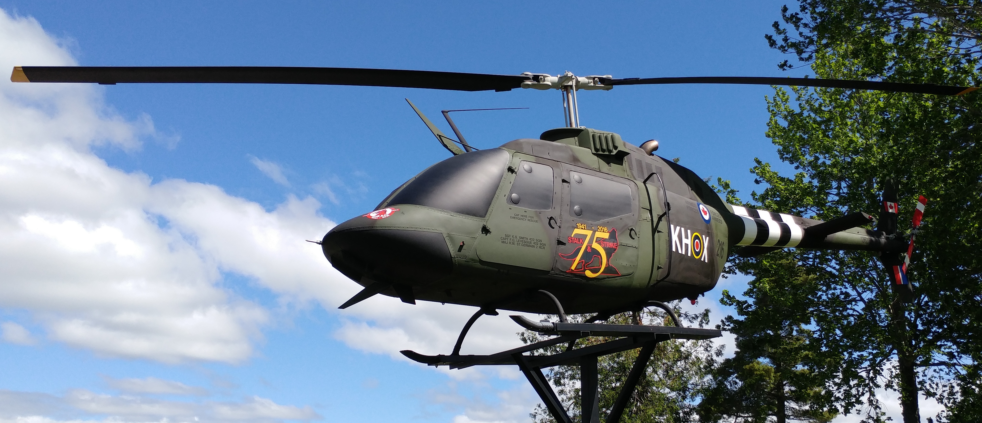 Bell CH-136 Kiowa Helicopter (Serial No. 136216), mounted on a pylon, 403 Helicopter Operational Training Squadron, 1 Wing, 1 Canadian Air Division. 5 Canadian Division Support Group Base Gagetown, New Brunswick.
