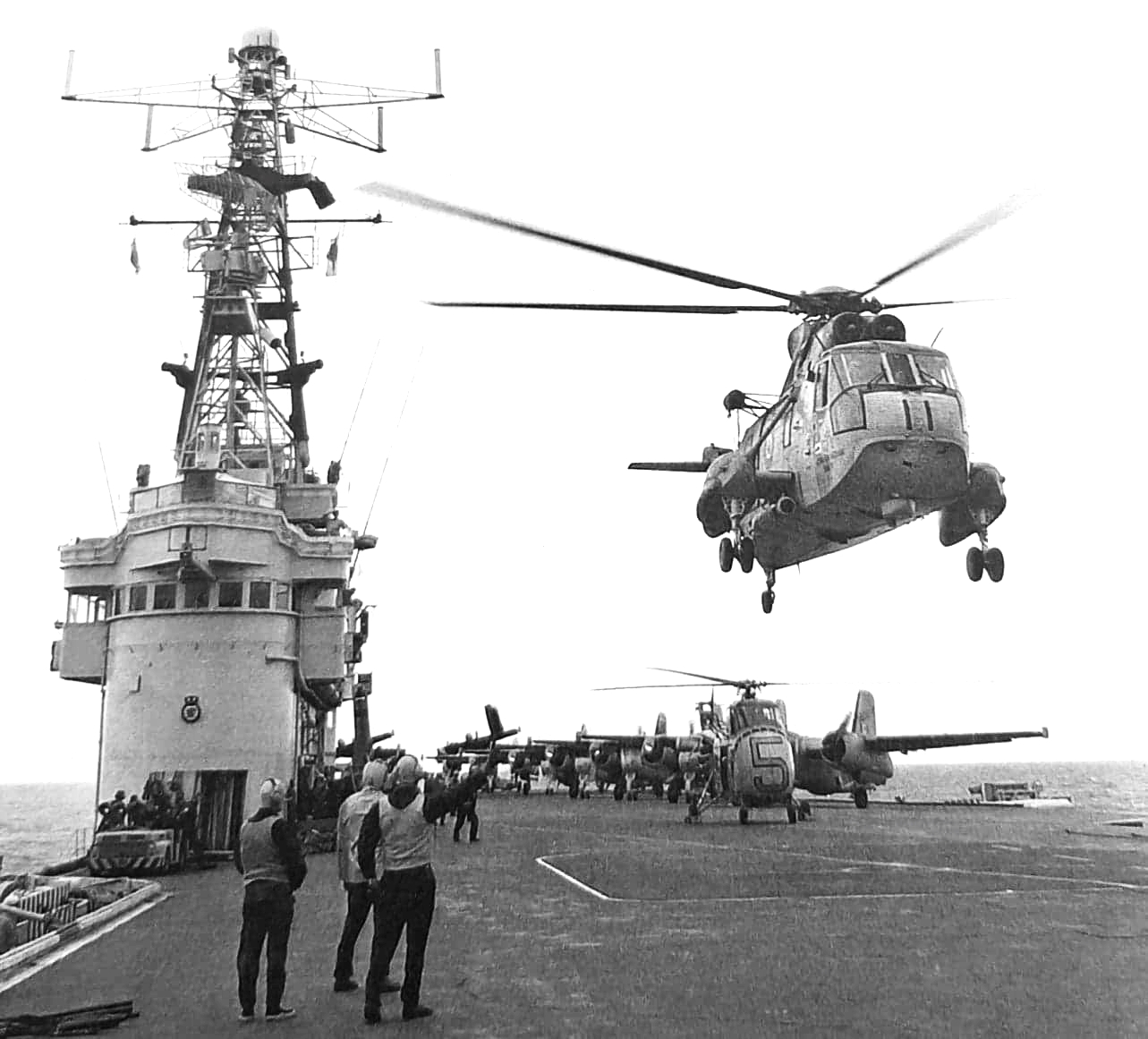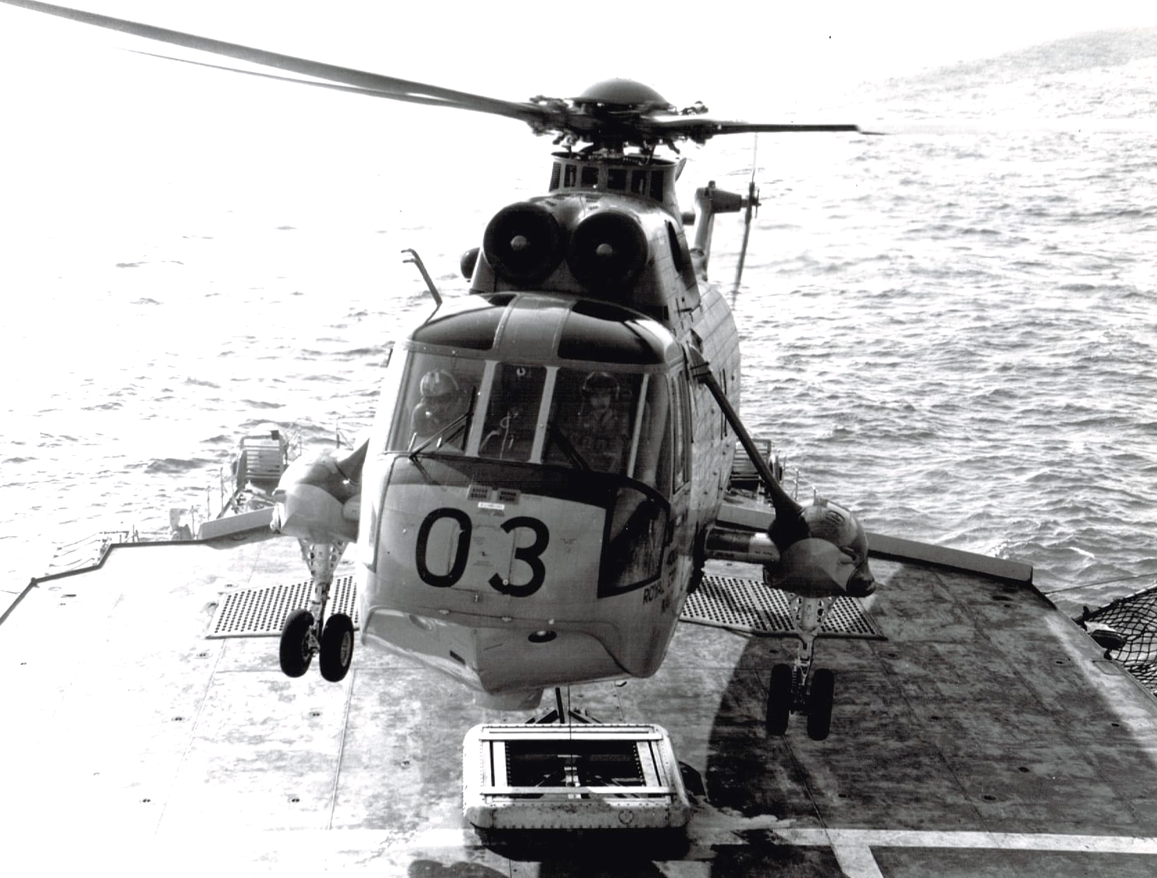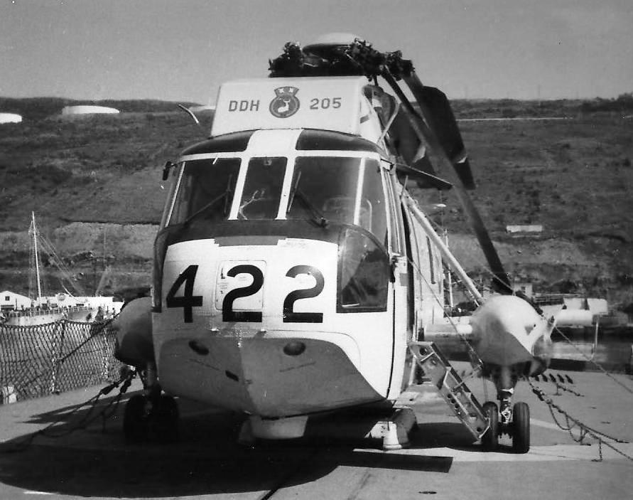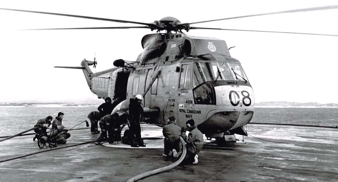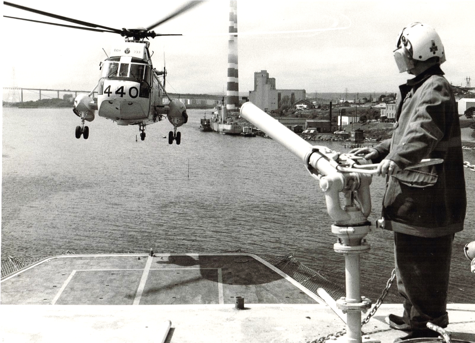 Dramatic shot in 1972 of CAF Sea King 439 of DDH 229, HMCS Ottawa (look at the FOD screen). It looks slippery with a wet deck, swells and rotor down wash as all the people standing on the HMCS Okanagan hold onto a rope as the helicopter approaches with a person on the hoist. What’s even more amazing is that in these conditions the person on the hoist and the Lt on the deck are wearing Oxford shoes! There is a swimmer (wet suit and flippers) and three crewmembers wearing heavy large black gloves. I am guessing that is due to the static build up of electricity in the helicopter and then touching the person on the hoist.