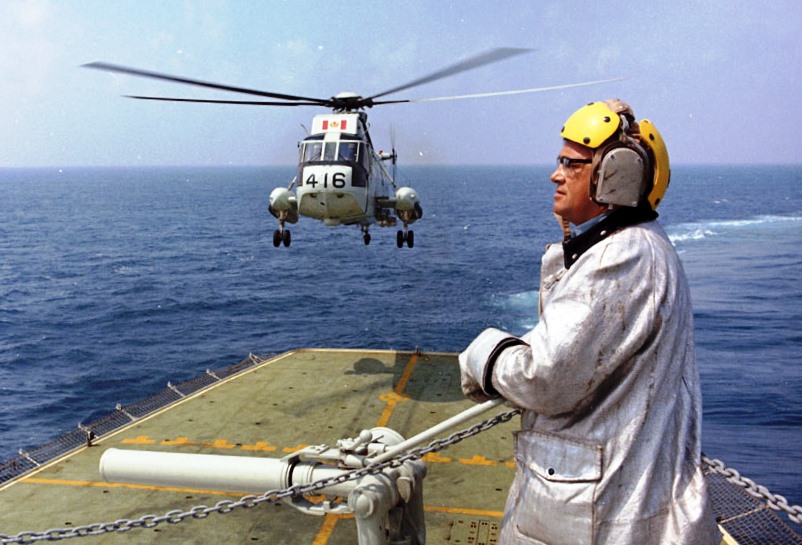 Cpl. Lawrence Brown is shown standing by a fire fighting gun on top of the hangar of HMCS Preserver while HMCS Nipigon’s helicopter, Sikorsky CH-124 Sea King (Serial No. 4016), is landing on board during exercises with the NATO Forces in the Atlantic Ocean.