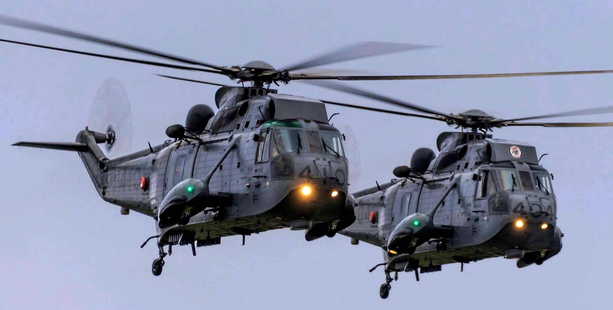 Sikorsky CH-124 Sea King (Serial No. 4010) and (Serial No. 4004), No. 443 Squadron in formation over Patricia Bay, British Columbia, 1 Dec 2018.