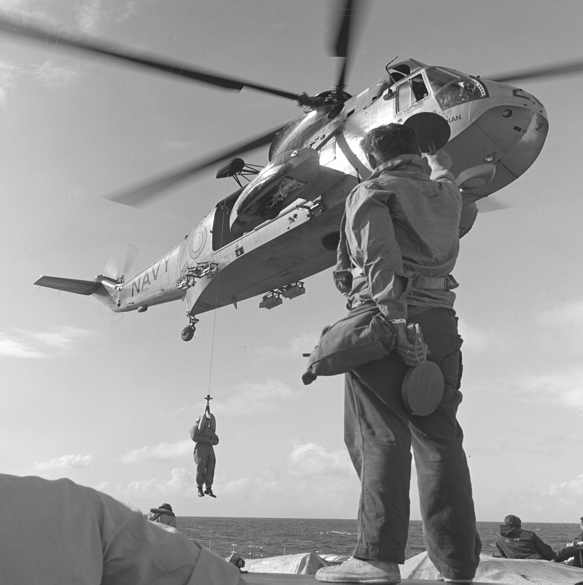 Air Marshal F. R. Sharp DFC, CD RCAF, VDCS is lowered from a Sea King helicopter to HMCS Restigouche during his visit to Exercise Maple Spring taking place off Puerto Rico in 1966.