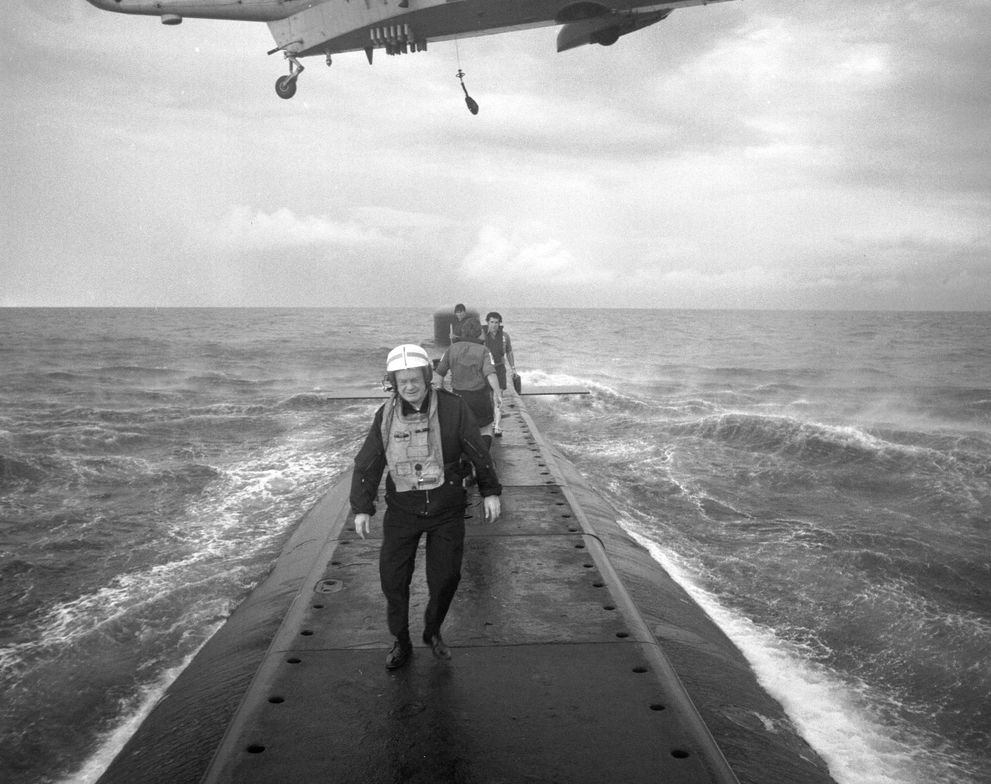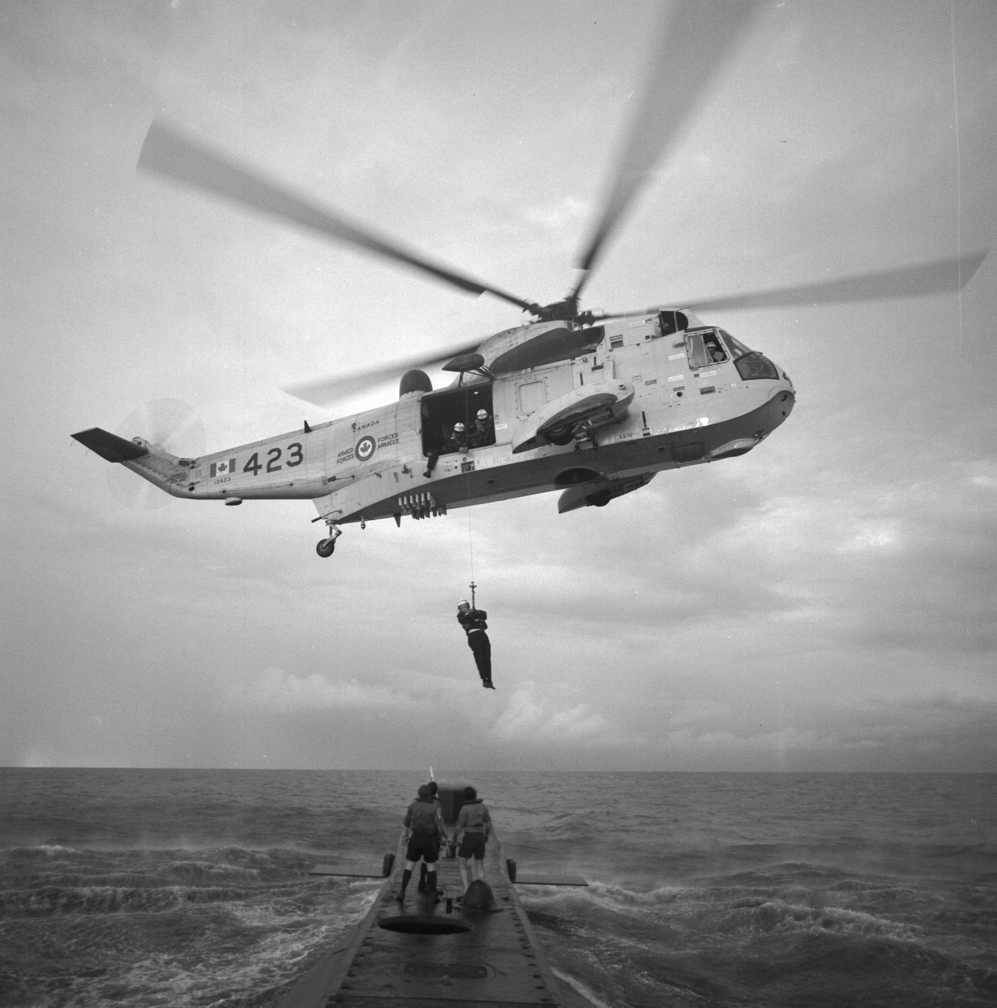 Canadian Vice Admiral Allan is being lowered from CAF Sea King CH-124423 onto, according to the photo caption, HMS Oden, an RN sub, in 1980.