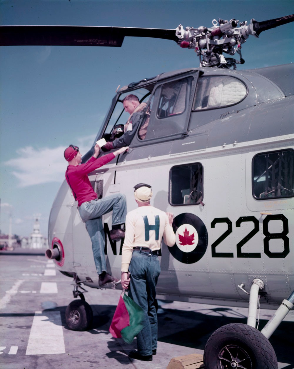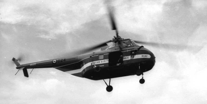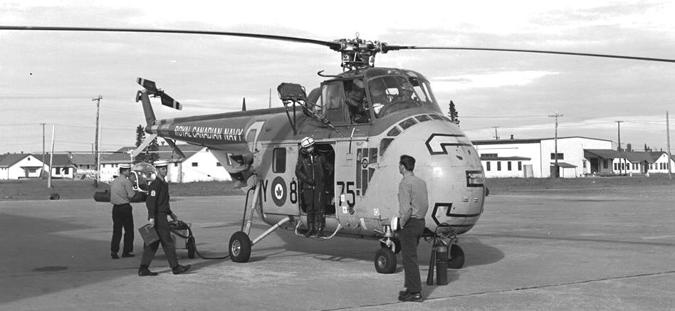 Sikorsky HO4S-3 Sea Horse, (Serial No. 55875), coded 875, being prepared for flight.  875 was preparing for the Labrador forest fires in 1967.  At this point most of the RCN’s HO4S-3 helicopters had been retired. Note the uniforms and the Bell HTL in the background.