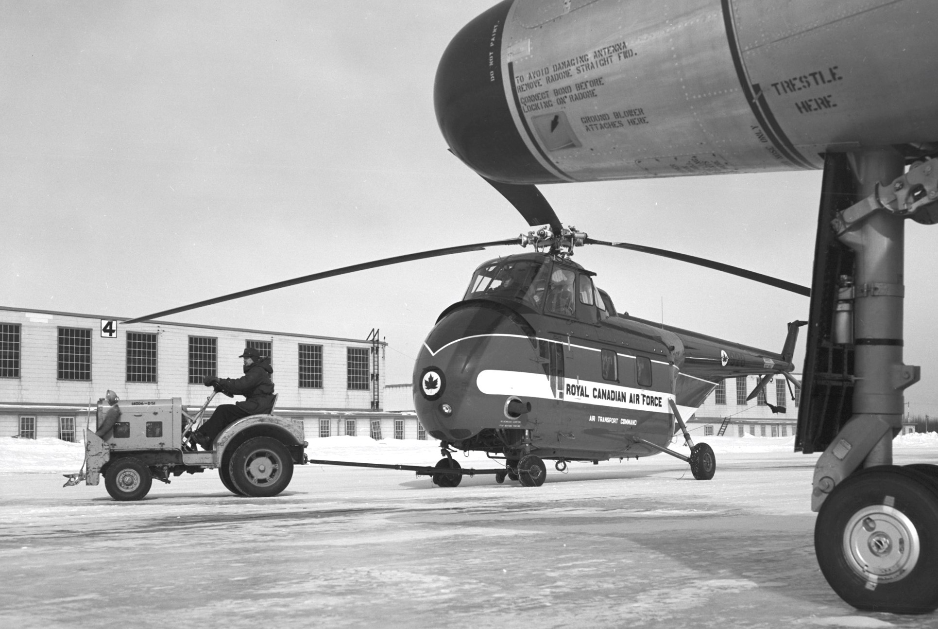 Sikorsky H-19 Chickasaw helicopter of No. 108 Communications Flight, RCAF Station Bagotville, Quebec, is momentarily framed by the nose and front wheel of an Avro CF-100 Canuck Mk. 4, as it is towed out to join other helicopters already on the flight line.