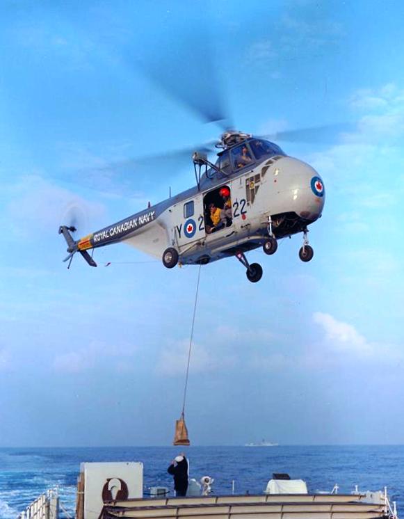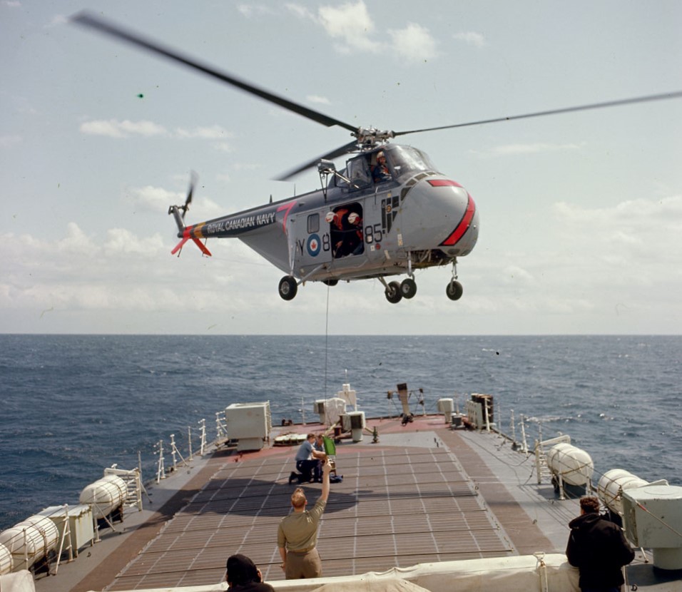 Sikorsky Sea Horse hovering above HMCS Chaudiere, c1960s.