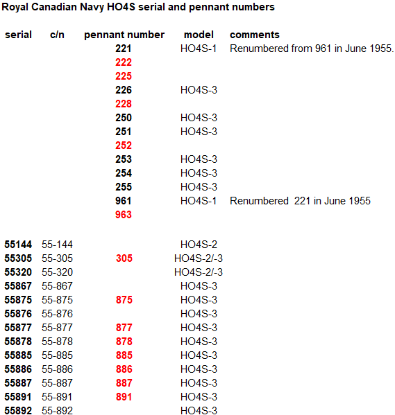 Sikorsky S-55 Horse, RCAF H-19 Chickasaw Helicopter (15), (Serial Nos. 9597, 9598, 9599, 9600, 9619, 9620, 9621, 9622, 9623, 9624, 9625, 9626, 9627, 9628, 9629), RCN HO4S-2 Sea Horse Helicopter (1), (Serial Nos. 55144), RCN HO4S-3 Sea Horse (12), 55305, 55320, 55867, 55875, 55876, 55877, 55878, 55885, 55886, 55887, 55891, 55892), for a total of 28 helicopters.