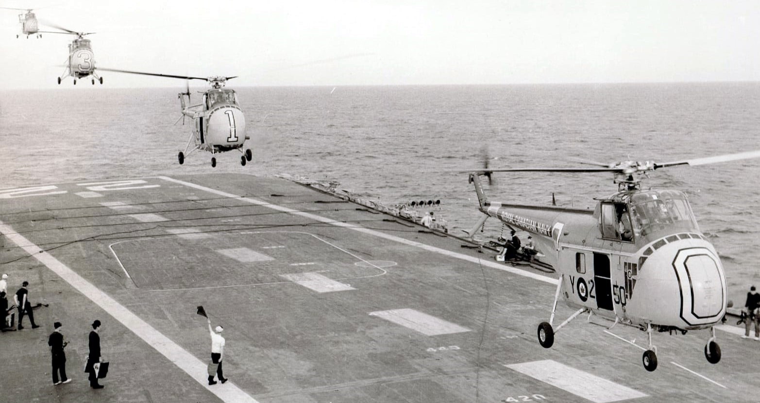 RCN H04S helicopters numbered 4-1-2-3 used for anti submarine work, on board HMCS Bonaventure. The HO4S in the air is the plane guard for rescue of downed aircraft.
