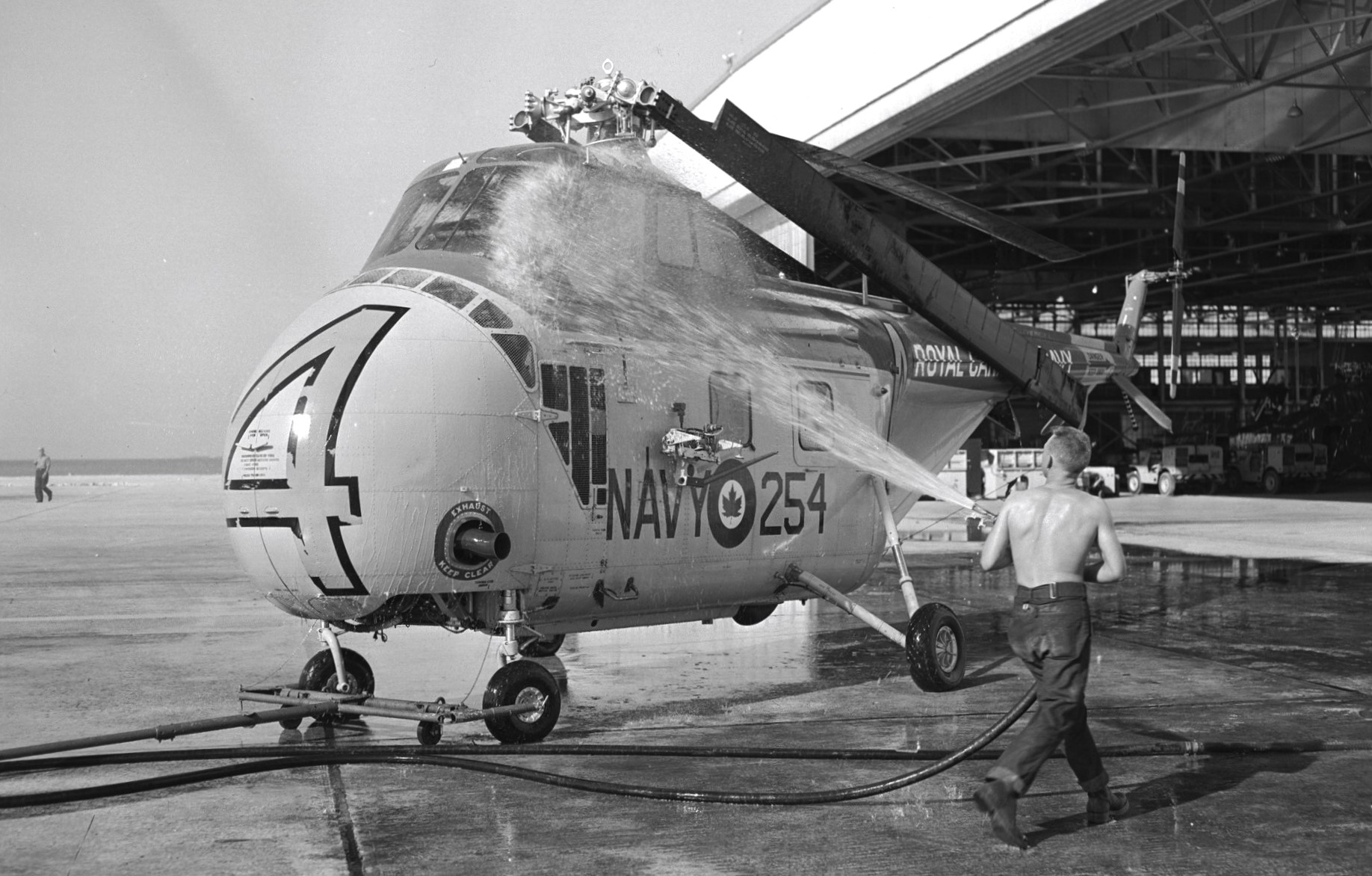 Sikorsky HO4S-3 Sea Horse, coded 254. One of HS-50 Squadron helicopters being hosed down before being returned to the hangar for the night. The helicopters were washed down after they had been out on exercise, to wash any salt off that may have been splashed onto the helicopter when they were hovering.
