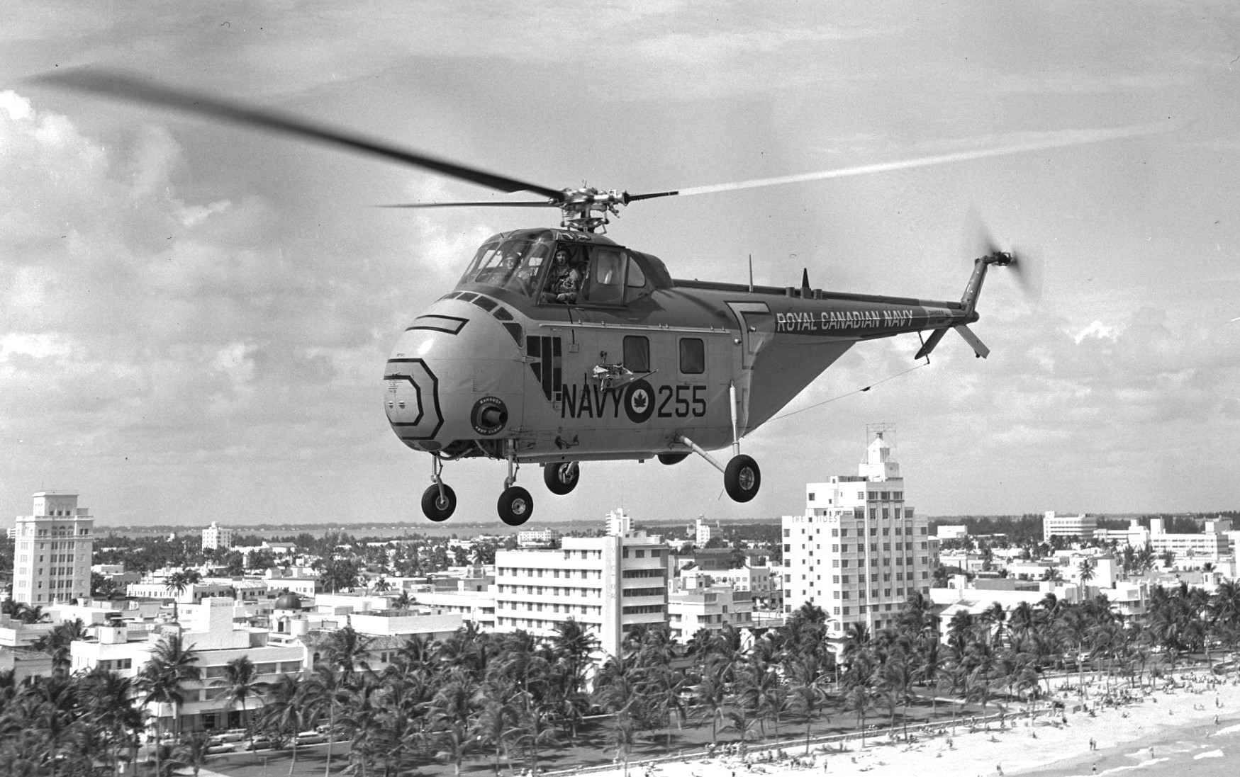 Sikorsky HO4S-3 Sea Horse, coded 255. HS 50 squadron flight from Shearwater, Nova Scotia to Key West, Florida, for three months of training with the United States Navy. This is one of HS 50 squadrons helicopters flying over Miami Beach, Florida.