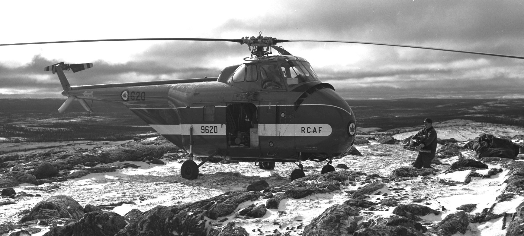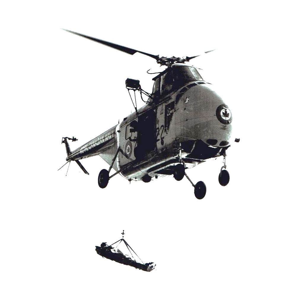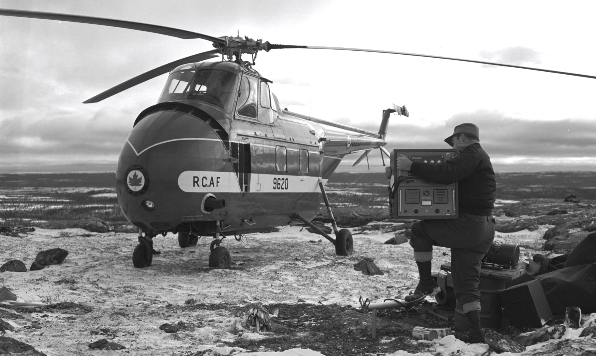 Sikorsky H-19 Horse Helicopter, RCAF (Serial No. 9620), C/N 55-213. “A signal reception test completed, radio equipment is loaded aboard an RCAF H-19 helicopter for transport to the next test site on the Mid-Canada Line. This operation is typical of much of the pre-construction work necessary in setting up the “McGill Fence”.