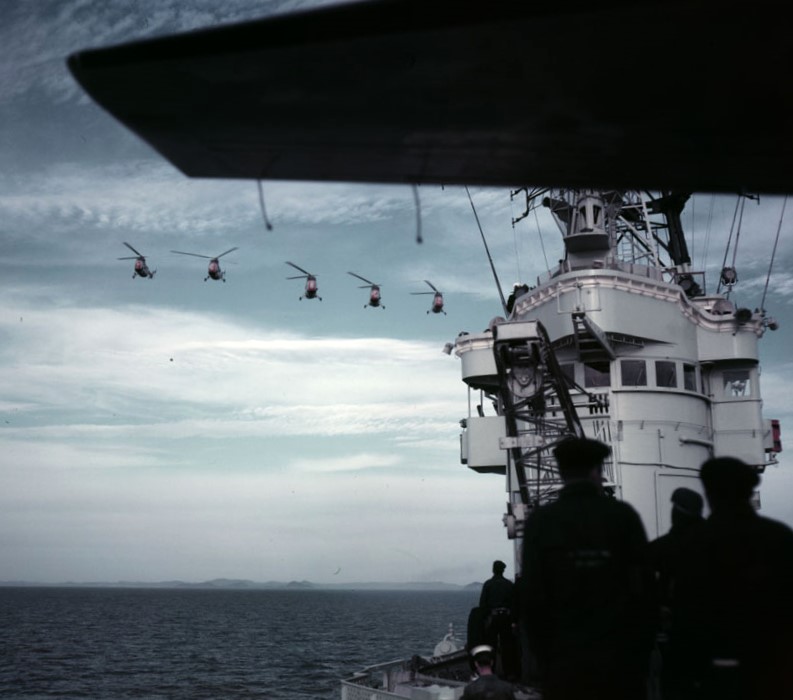 Sikorsky HO4S-3 Sea Horse helicopter formation over HMCS Bonaventure, 1957.