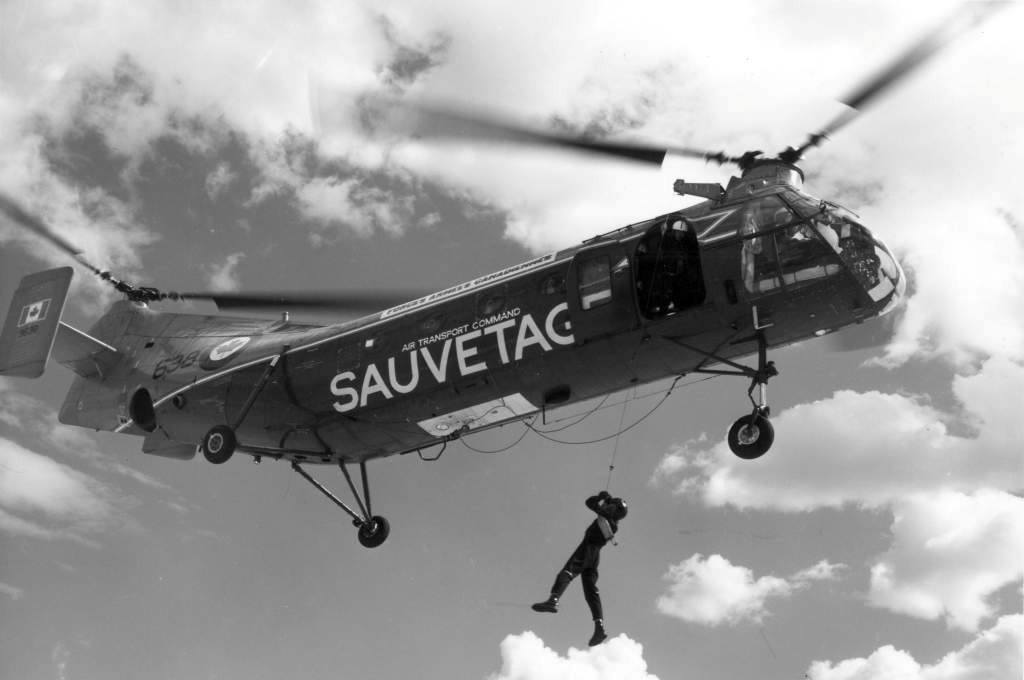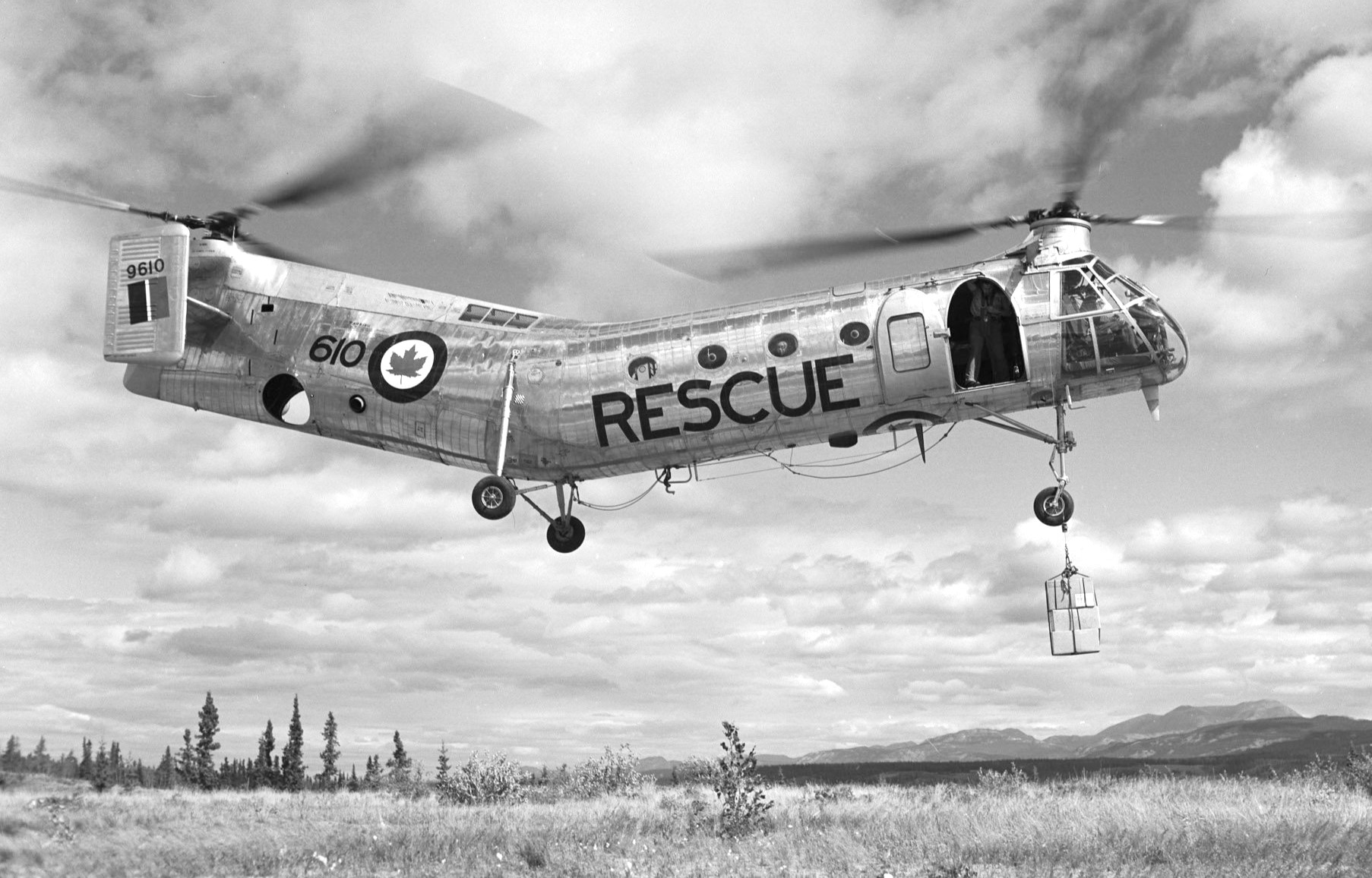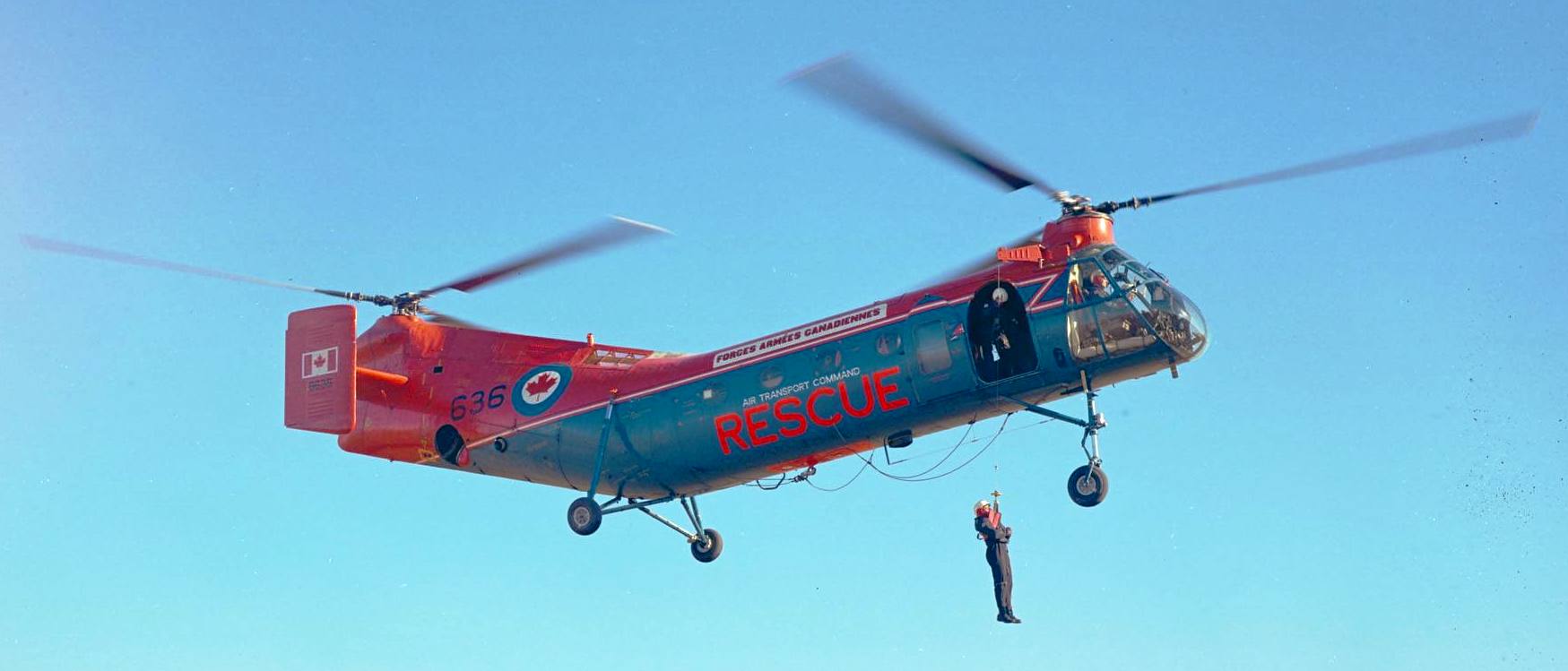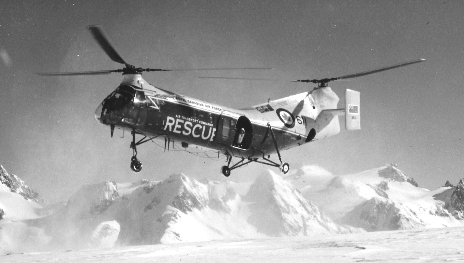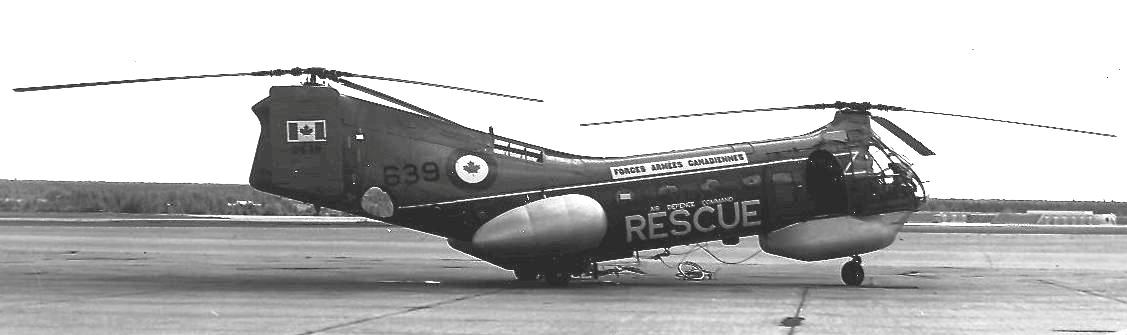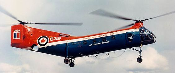 The Vertol Canada Workhorse, commonly called “the flying banana”, was a single engine, tandem rotor helicopter acquired by the RCAF in 1954 and used primarily for search and rescue work.  It was designed to serve as a multi-mission helicopter, utilizing wheels, skis, or floats, based on the American Piasecki H-21 Workhorse/Shawnee.  Originally developed by Piasecki as an Arctic rescue helicopter, the H-21 had winterization features permitting operation at temperatures as low as −65 °F (−54 °C), and could be routinely maintained in severe cold weather environments.