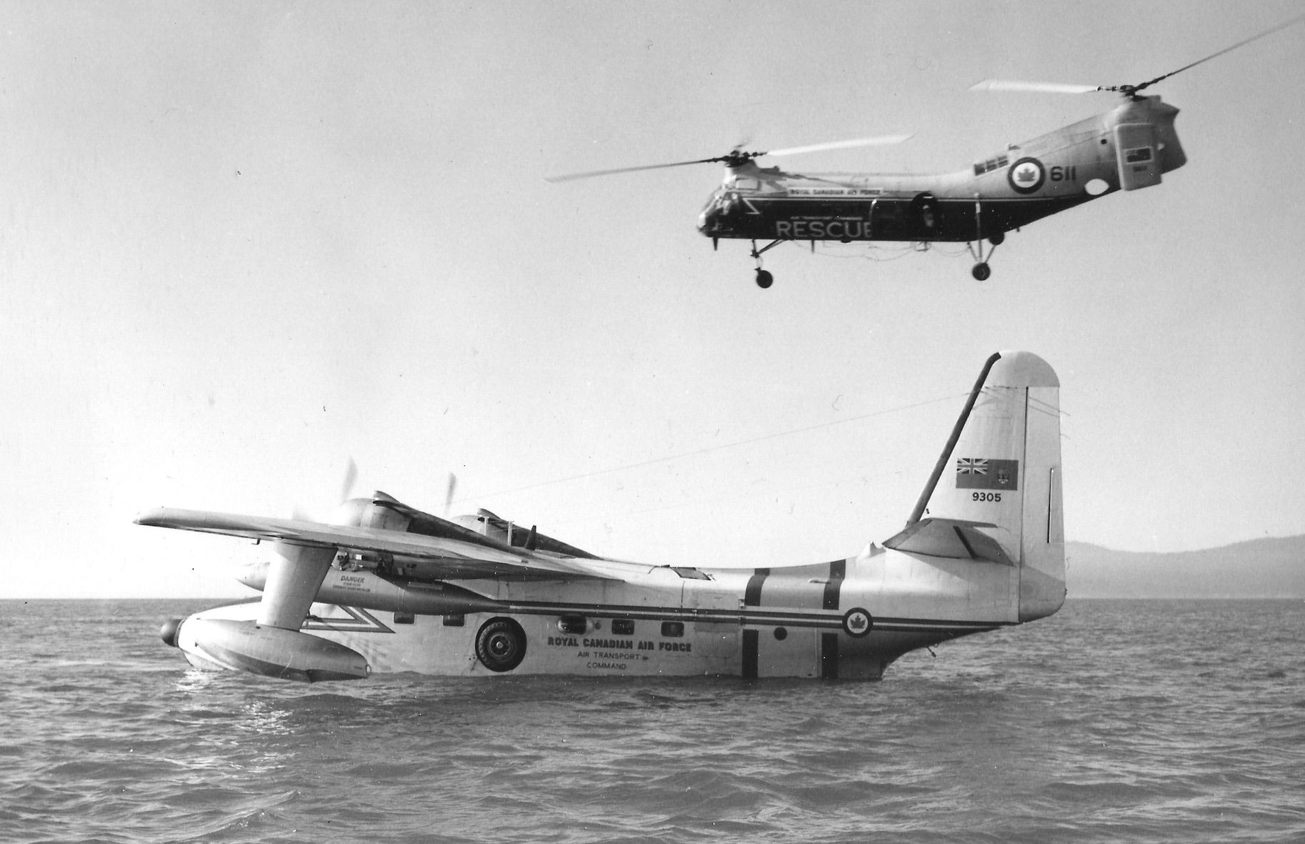 Vertol Canada H-21 Workhorse helicopter (Serial No. 9611). with a Grumman CSR-110 Albatross, RCAF (Serial No. (9305). Both flew with with No. 121 (K) Unit at RCAF Station Sea Island, BC in 1963 and 1964.