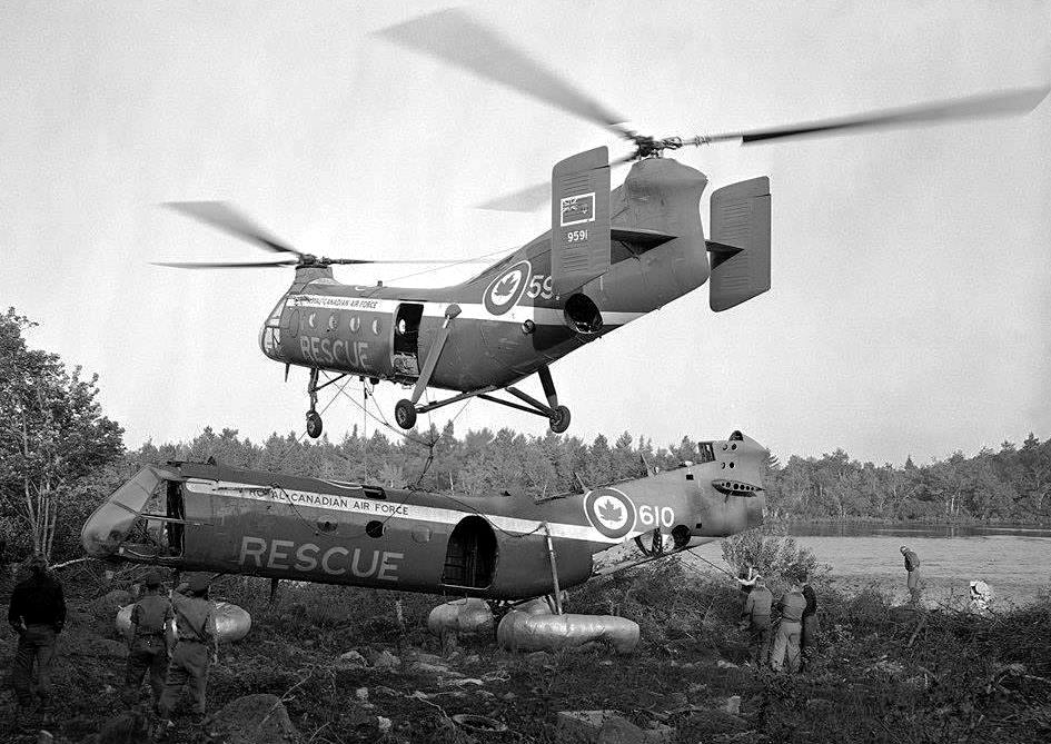 Vertol Canada  CH-127 Workhorse (Serial No. 9591) hoisting CH-125 (Serial No. 9610), near Greenwood, Nova Scotia, 6 Jun 1961.