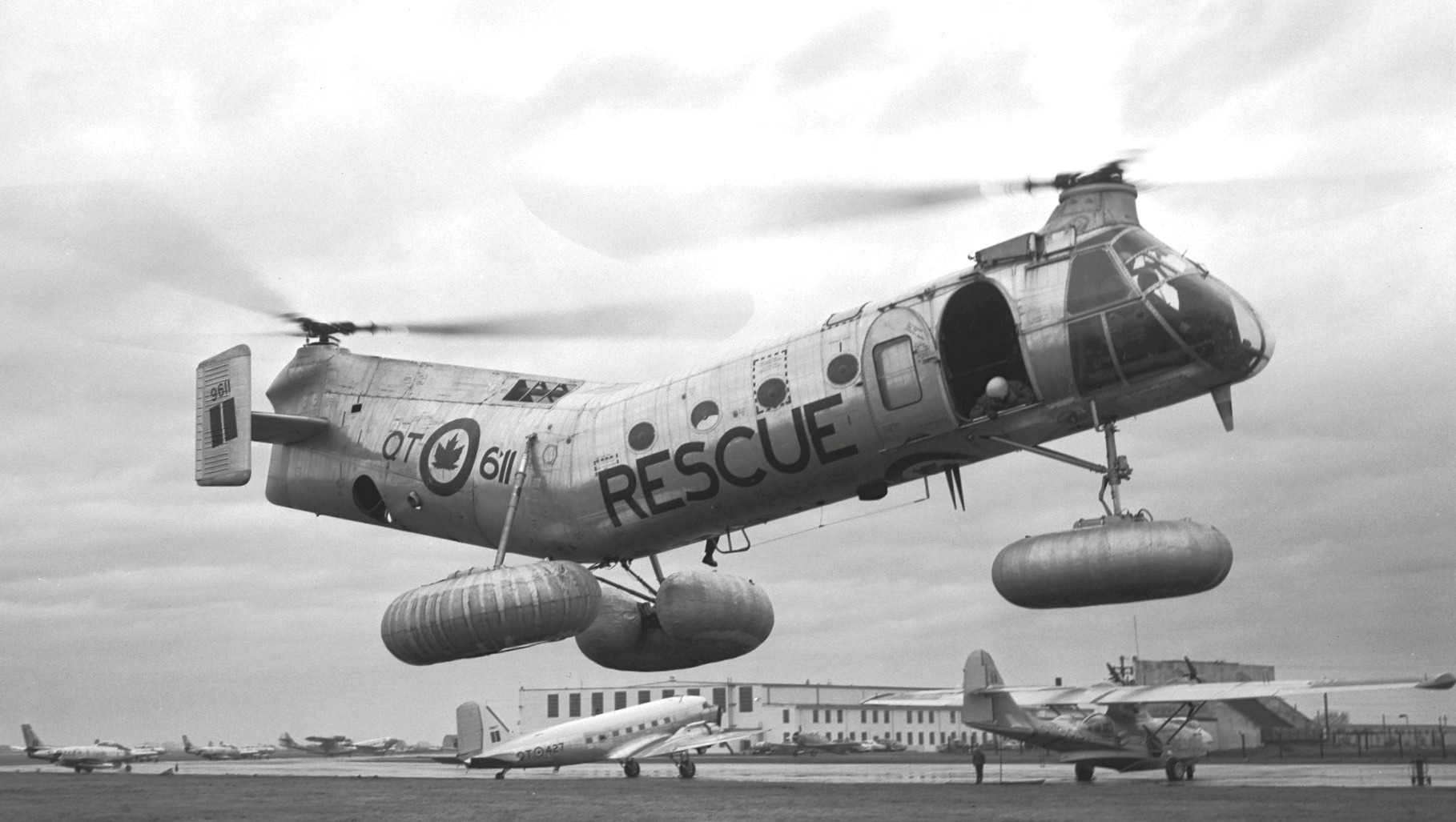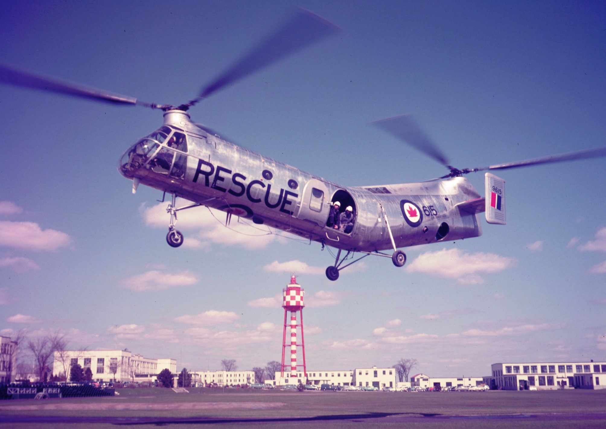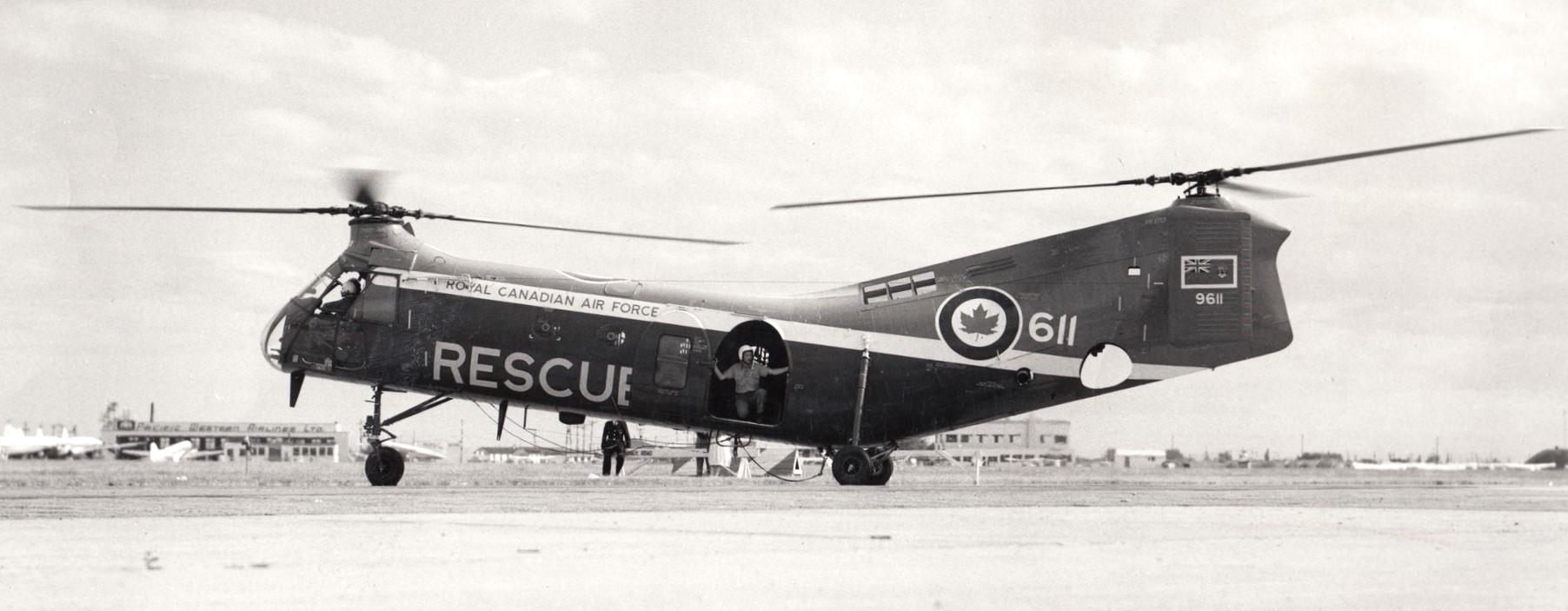 Vertol Canada CH-125 Workhorse (Serial No. 9611).  This helicopter served with No. 121 Communications and Rescue Flight – RCAF Station Sea Island, British Columbia, No. 121 Composite (K) Unit, RCAF Station Comox, British Columbia, and No. 111 (K) Unit, RCAF Station Winnipeg, Manitoba.  9611 is hovering while doing float tests.  Note the crewman on the floor in the door calling the height for the pilot.  This particular aircraft was in RCAF service from 1954 to 1966.  In the background you can see two Cansos, two Sabres, two CT-133’s, two Dakotas and possibly a Harvard.