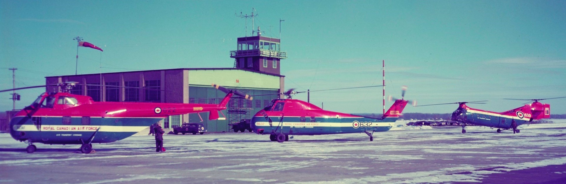 Sikorsky H-19 Chickasaw helicopter, RCAF (Serial No. 9622), Sikorsky CH-126 Choctaw (Serial No. 9632) and Vertol Canada CH-125 Workhorse (Serial No. 9639).  These helicopters are from No. 108 Communications Flight which was heavily involved during the construction of the DEW Line. On the 1st of June 1958 the Flight was re-designated as No. 5 (Helicopter) Operational Training Unit and was tasked with training H-21 and H-34 pilots. No. 108 Flight was based at Rockcliffe and Bagotville.