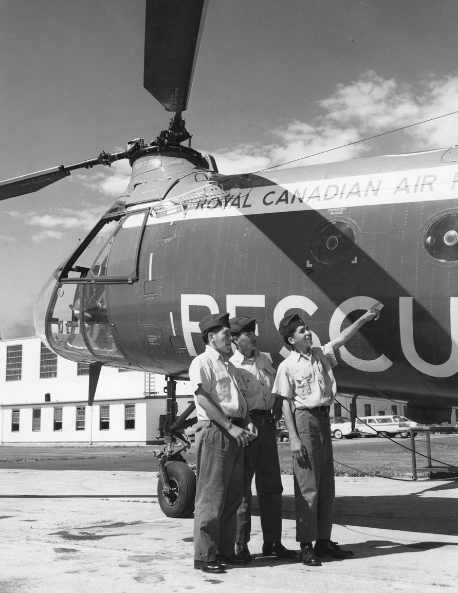 No. 633 Squadron cadets looking over an RCAF Vertol Canada H-21 Workhorse helicopter at Sea Island, British Columbia, during Summer camp are, left to right: Mervin and Fred Stevenson and Lawrence Cote.