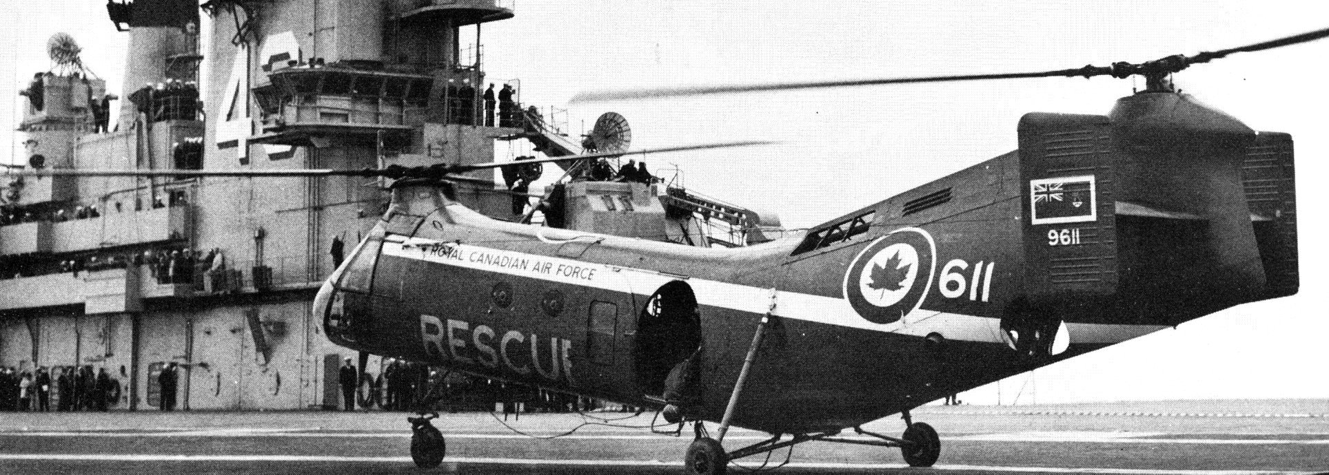 Vertol Canada CH-125 Workhorse (Serial No. 9611), from No. 121 Communications & Rescue Flight based at RCAF Station Sea Island, pays a viist to the USS Coral Sea during her visit to Vancouver in 1960.