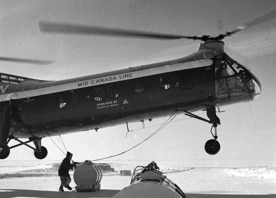 After construction of the sector of the Mid-Canada Line from Hopedale, Labrador to Great Whale River, Quebec was finished, the D.N.D. tendered a contract for its support. Spartan Air Services of Ottawa, Ontario submitted the winning bid. They were to supply each Sector Control Station with fuel, food and perform general duties including the support of the unmanned Doppler Detection Stations. During the construction phase, helicopter support operations had been carried out by 12 tandem-rotor Vertol H-21B’s (Vertol Model 42A) of the Royal Canadian Air Force’s No. 108 Communications Flight. The H-21 was affectionately known as the ‘Flying Banana’ due to its unique fuselage design. With Spartan assuming support responsibilities in 1958, the R.C.A.F. H-21B’s were transferred to the company and given civilian registrations. Before Spartan commenced operations with the H-21-B’s, Vertol Aircraft in Arnprior, Ontario carried out an exclusive conversion of nine aircraft for civilian use. Spartan operated from R.C.A.F. Station Knob Lake, Quebec which bordered the mining community of Schefferville as well as R.C.A.F. Station Great Whale River, Quebec located on the eastern side of James Bay. Toronto, Ontario-based Dominion Helicopters was awarded the contract in 1959. They provide support services until the line was shut down in April 1965.