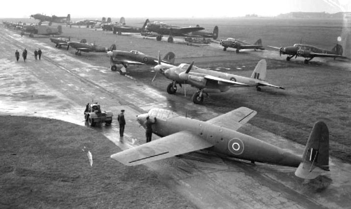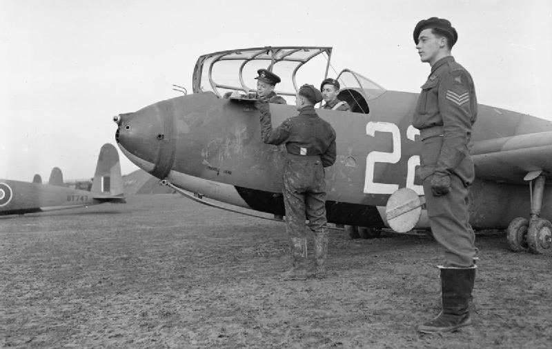 General Aircraft GAL.48 Hotspur Mk. II Glider in the foreground, with aircraft of the Empire Central Flying School lined up for display at RAF Hullavington, Wiltshire. In the front row, right to left: De Havilland Mosquito, Hawker Typhoon, Supermarine Spitfire, Percival Proctor, Grumman Avenger, Hawker Hurricane and three Miles Masters. In the back row, right to left: Avro Anson, Airspeed Oxford, De Havilland Tiger Moth, Avro Lancaster, Miles Magister, Vickers Wellington, Douglas Boston, North American Mitchell, Miles Master and Short Stirling, c1945.