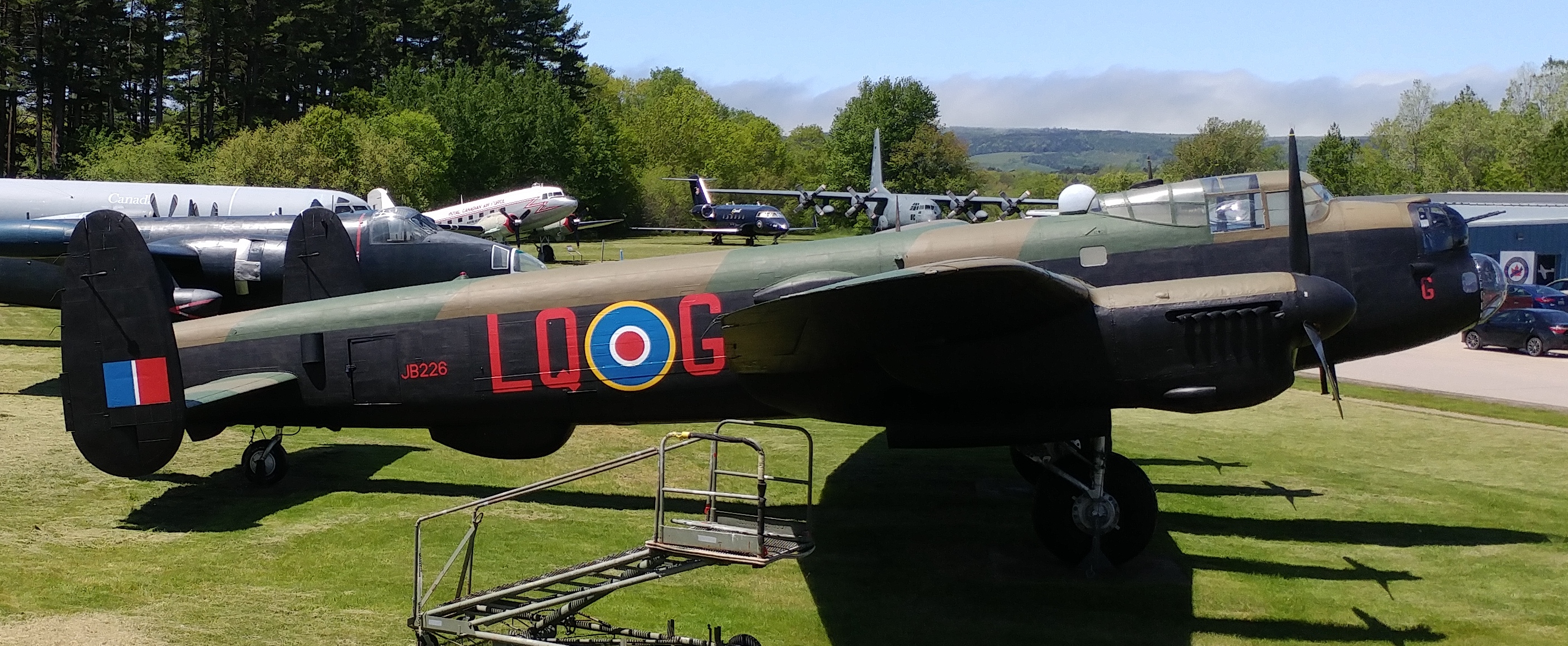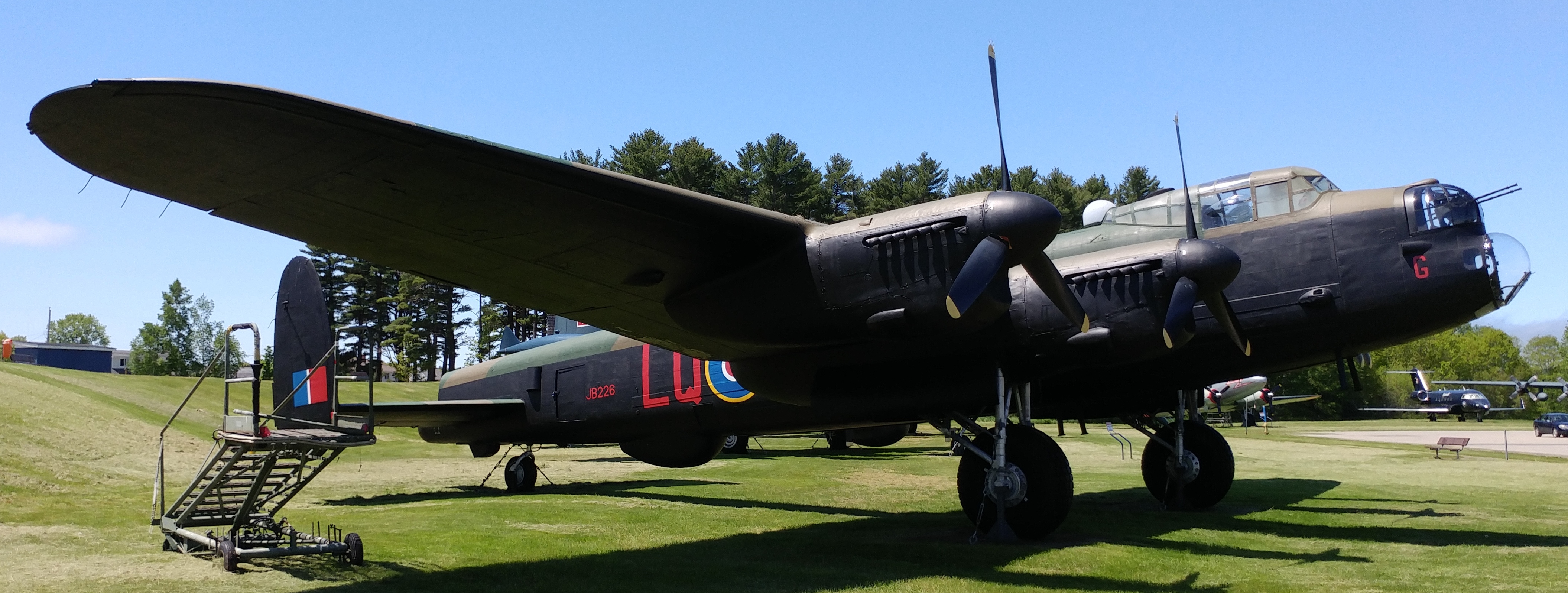 Avro Lancaster Mk. B.X (Serial No. KB839), painted as (Serial No. JB266).  Built in Malton, Ontario in 1944, this aircraft flew 26 bombing sorties from the UK with RCAF No. 419 “Moose” Squadron.  It was nicknamed “Daisy” after a dog in a popular comic strip.  KB839 sustained damage on two occasions but survived the war and later flew with No. 409 “Goose” Squadron in Canada.  It was modified with a longer (31-inch) nose to facilitate the installation of cameras for arctic mapping and reconnaissance duties, and the nose, dorsal and tail turrets were removed.  KB839 was last flown on 11 Mar 1964, and retired in Greenwood.  In the summer of 1987, its four engines and propellers were donated to the Canadian Warplane Heritage Museum for use on FM213, coded VR-A, currently one of  only two flying Lancasters in the world.  The restoration crew have returned this aircraft to its wartime configuration by removing the 31-inches from the nose and extensively refurbishing the bomber.  An accurate reproduction of a Frazer-Nash nose turret and a dorsal turret have been added, and a tail turret is to follow soon.