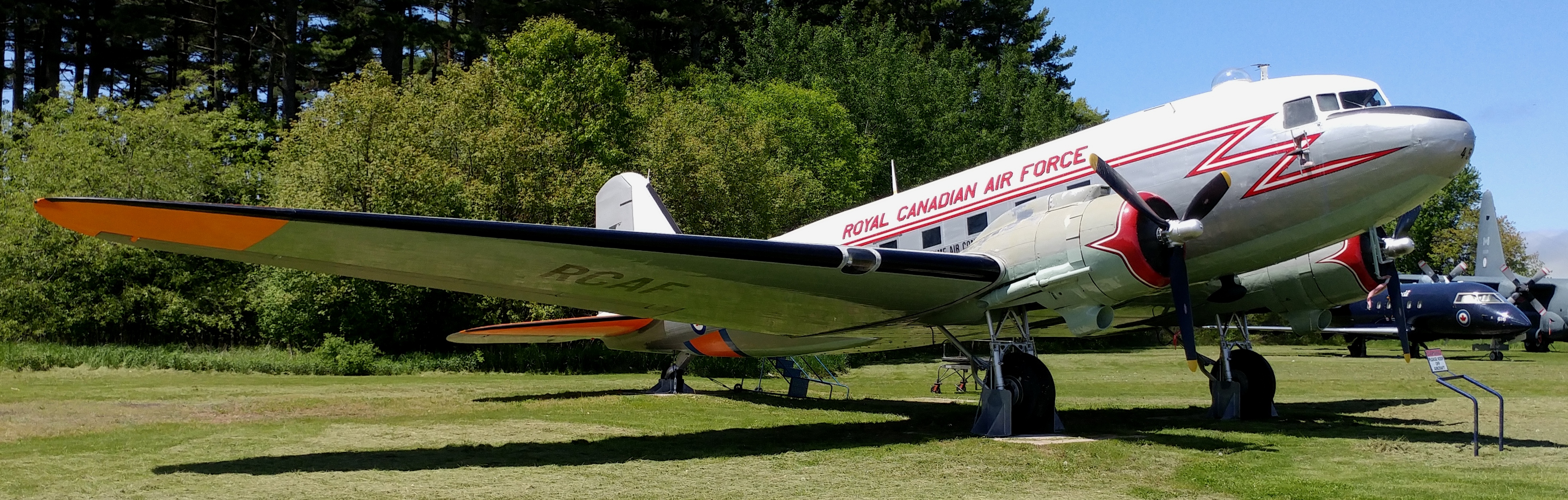 Douglas CC-129 Dakota (Serial No.44-76590).  Built in 1944 as a Douglas C-47B Skytrain for the USAAF, it was transferred to the RAF in 1945 and assigned to RCAF No. 436 Sqn (Serial No. KN451) in Feb 1946.  It went to the Canadian Aviation Museum in Ottawa in 1964, and to CFB Greenwood in 2006.  It is painted  as an aircraft flown by 103 Rescue Unit from 1946 to 1968.