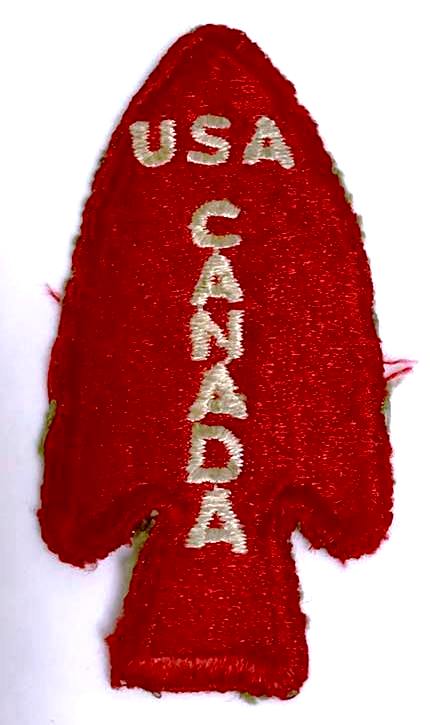 The First Special Service Force, a Joint U.S.-Canadian Fighting Unit: The insignia of the First Special Service Force, composed of US and Canadian soldiers in training at Ft. William Henry Harrison, Montana, is an Indian spearhead of deep red with the “USA” and “Canada” forming a white T against the background. The patch is worn on the left shoulder of the soldier, who is shown here sewing the coveted emblem to his blouse. The braided cord, of red, white and blue also signifies the wearer as a member of “the force.” 1943.