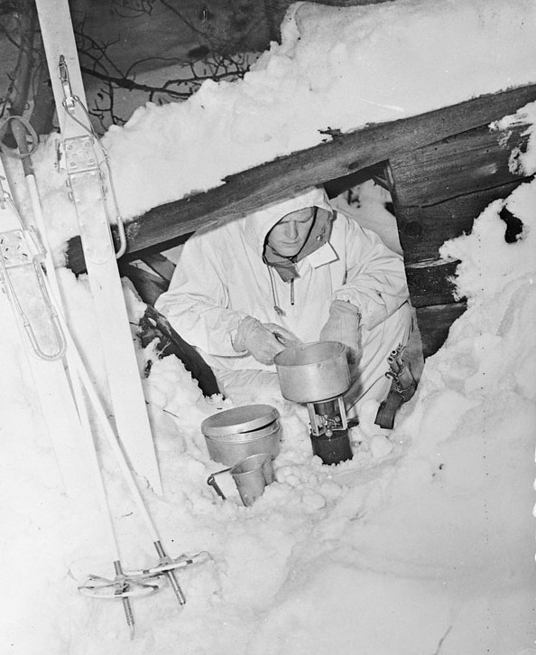 Forceman of the First Special Service Force preparing rations in an improvised shelter during cold weather survival training, Blossburg, Montana, United States, January 1943.