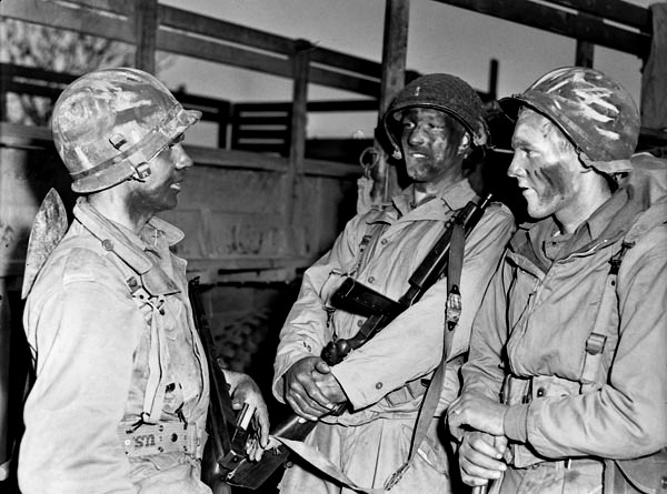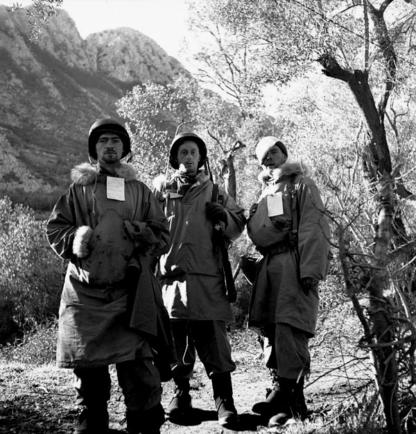 Sergeant Charles Shepard (6-2), Lieutenant Henry H. Rayner (5-2 &1-2), Private First Class James A. Jones (5-2 & 6-2), Forcemen of the First Special Service Force preparing to go on an evening patrol in the Anzio beachhead, Italy, ca. 20-27 April 1944.