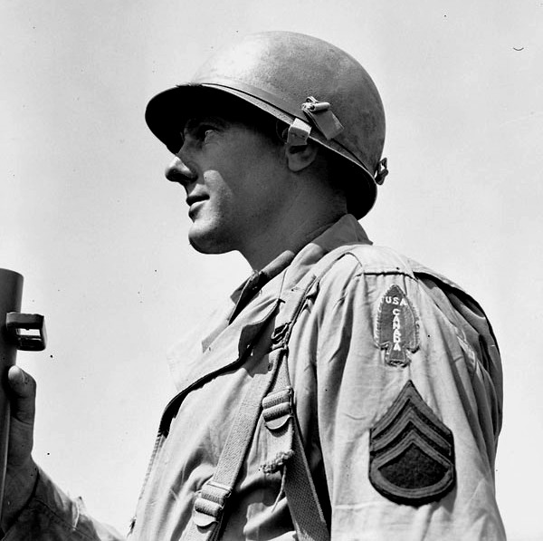 FSSF Sergeant, wearing the distinctive FSSF patch on his shoulder, Anzio, Italy, 20 Apr 1944.  He is armed with a  2.36-inch Bazooka man-portable recoilless anti-tank rocket launcher, widely fielded by the United States Army during the Second World War.  Also referred to as the “Stovepipe”, the innovative bazooka was among the first generation of rocket-propelled anti-tank weapons used by infantry in combat.