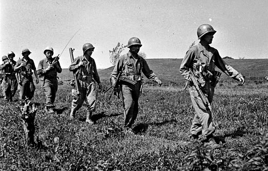 Infantry on Patrol in Italy. There is nothing in front of the Infantry in battle except the enemy. The Infantry leads the way to attack and bears the brunt of the enemy’s attack. The primary purpose of the Infantry is to close with the enemy in hand-to-hand fighting. Men of this Infantry patrol, one of the many that made possible the present offensive in Italy by feeling out the enemy and discovering his defensive strength, skirt a mine field along the barbed wire as they advance on a farmhouse containing Nazis, in the Anzio area, Italy. Fifth Army, April 14, 1944. 1st Special Service Force Patrol.
