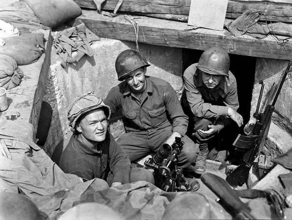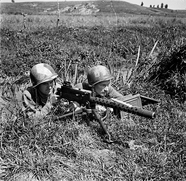Cyril L. Sullivan on the left and his loader, Forcemen of the First Special Service Force manning a .30 cal general purpose machine gun (GPMG) on Anzio Beach, ca 20-27 April 1944.