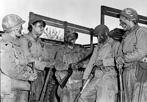 (L-R): Pvt Dan Lemaire (5-2 & 6-2), Pfc Richard Stealey (6-2), Sgt Charles Shepard (6-2), Lt H.H. Raynor (5-2 & 1-2), Pfc James A. Jones (5-2 & 6-2), Forcemen of 5-2, First Special Service Force, preparing to go on an evening patrol in the Anzio beachhead, Operation Shingle, Italy, ca. 31 March 1944.  The soldier on the left is carrying a .30 calibre M1941 Johnson Light Machine Gun (LMG) unique to the FSSF.