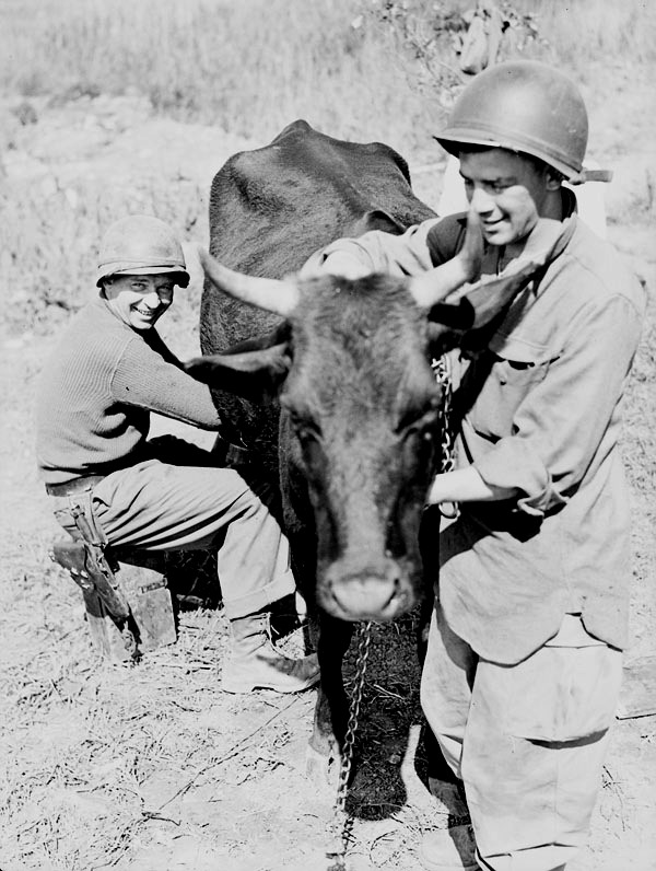 Forcemen of the First Special Service Force, milking a cow near Anzio Beach, 20 April 1944.  The soldier doing the milking is wearing a V-42 Stiletto combat knife beside his .45 cal M1911 pistol.