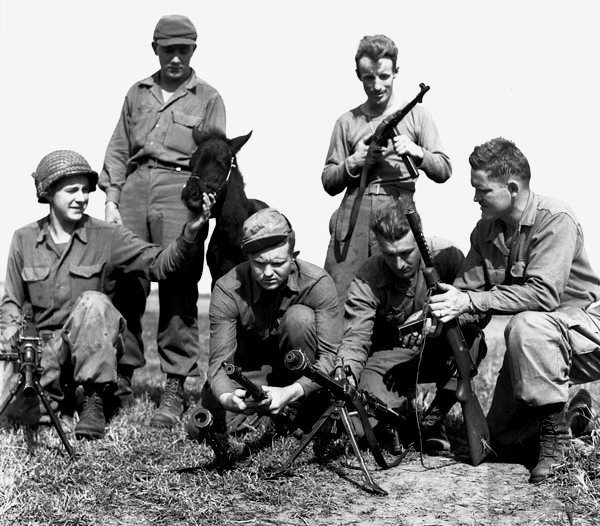 Canadian and First Special Service Force soldiers with captured automatic weapons in the Anzio beachhead, Italy, 20 April 1944.  According to Ted Morin, there is a story about the colt shown in this picture.  One night a patrol was returning, when they came upon a mare that had been killed, when it had stepped on a mine.  As they drew closer, they noticed a small black colt nestled against it.  A man picked up the colt and carried it back to safety, where they built a corral and shelter for it.  Over the next two months, it was kept warm and dry, and cared for night and day.  When the breakout occurred, arrangements were made to have “Anzio“, the name it was given, to be transported by truck and follow the Force advance.  In Rome, Anzio and the men were reunited.  When the Force moved to San Albano, the colt went with them.  There they came upon an Orphanage, for children, run by Catholic Nuns, and Anzio was turned over to the Nuns for the entertainment of the children.