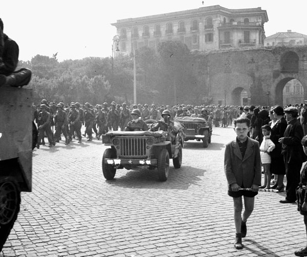 Entry of Allied Forces into Rome, 4 June 1944.  The vehicles unit markings have been edited out by the official censor.
