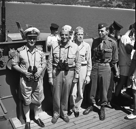 Here are four of the main figures in the invasion of the French islands of Port Cros and Levant which preceded the invasion of Southern France by a few hours in August 1944.  The photo was taken on the bridge of HMCS Prince Henry, a mother ship to Canadian assault craft.  Left to right, Captain V.S. Godfrey, Victoria, BC; Rear Admiral T.E. Chandler, USN, Washington, D.C. whose pennant on the Canadian ship made her the flagship for the operation, which he commanded; Captain G.E. Maynard, a veteran of the Normandy invasion directly in charge of the Levant assault; and Colonel Edwin Walker, who commanded the First Special Service Force from June to Dec 1944, assaulted the islands.  Shown in the background are two Canadian sailors, AB Les Cole of Belleville, Ontario and Leading Torpedo Operator Rod Harris of Calgary, Alberta.