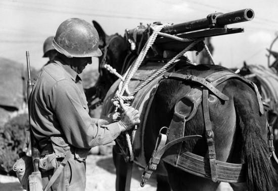 Soldiers adjust the straps that secure a machine gun to the back of a mule for transport.