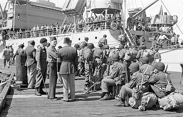 Canadian Infantrymen of the 13th Infantry Brigade Group, embarking in an American troopship to take part in Operation Cottage, the invasion of Kiska, July 1943.