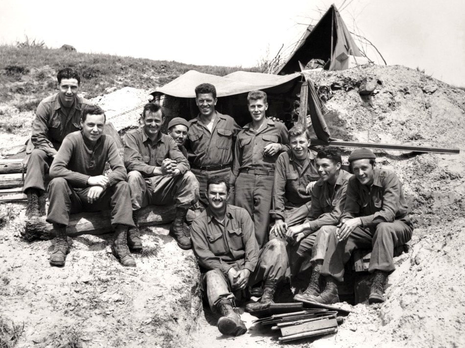 A 6-2 Section of the First Special Service Force led by SSgt KS Chapman, during a battle drill in the Anzio beachhead, Italy, ca. 20-27 April 1944.  Kenneth S Chapman (6-2), Thomas C Potenza (6-2, died of wounds 2 Nov 1944), Norman J Overall (6-2), Theodore F Olynyk (6-2) and Herman W McC, arthy (6-2, KIA 3 June 1944).