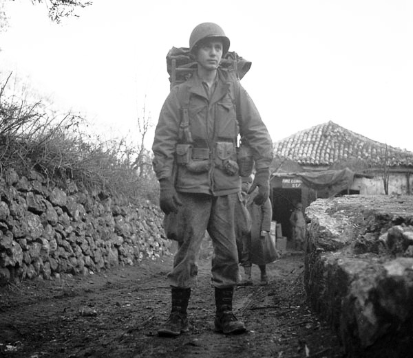 Lieutenant W.H. Langdon, carrying full kit, joins up with his unit, the First Special Service Force north of Venafro, Italy, January 1944.