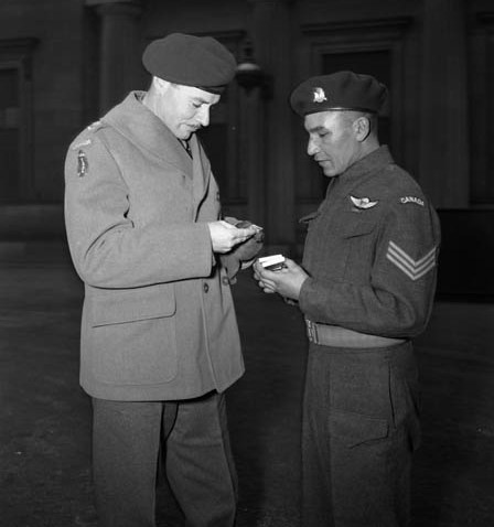 Sergeant G.A. Rainville, former Canadian member of the First Special Service Force, receiving the Silver Star from Brigadier-General E.F. Koenig, Commander of U.S. Forces in the United Kingdom, Canadian Repatriation Unit, England, 24 April 1945.