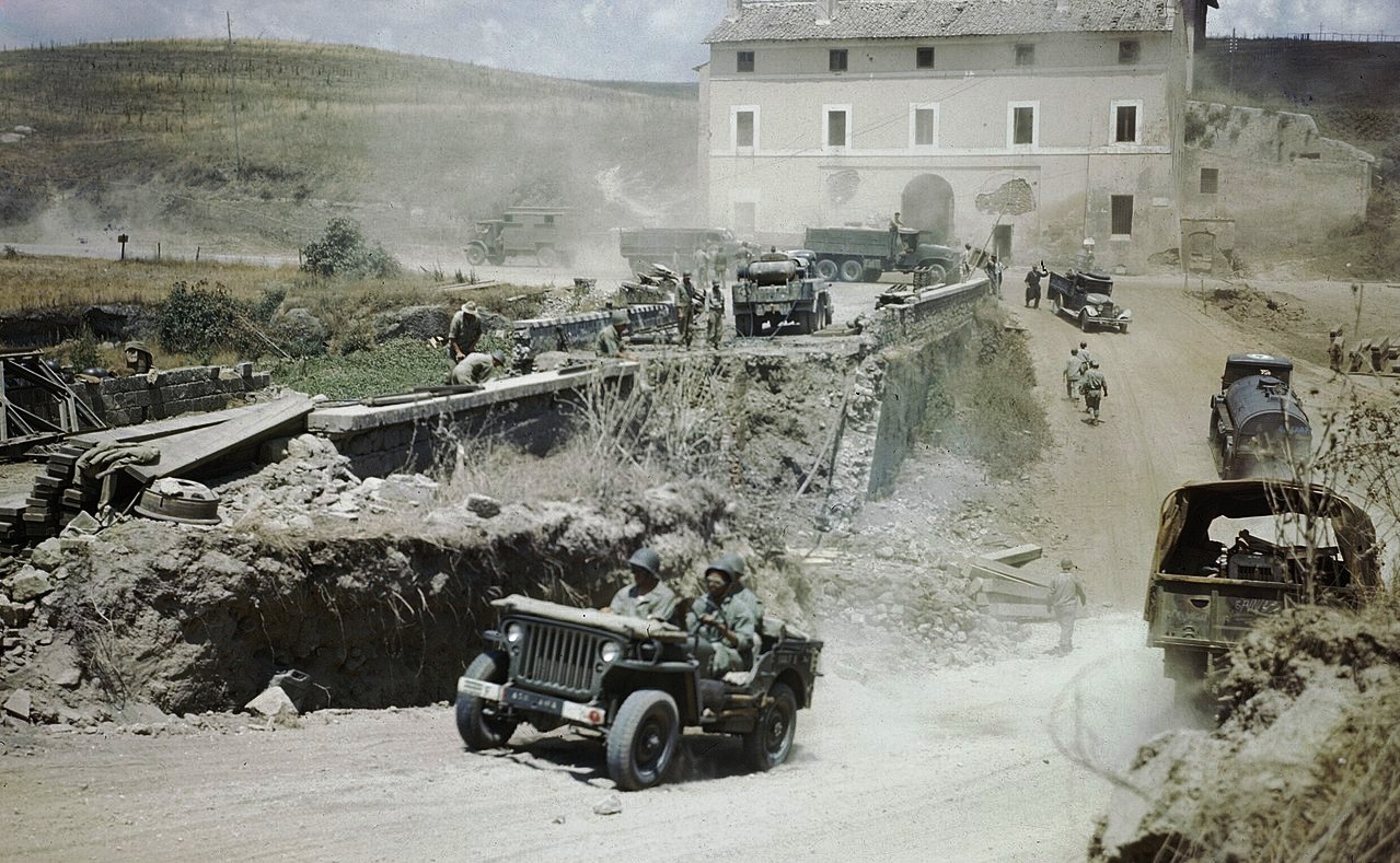 An American Army Jeep passing a demolished bridge under repair by American Army Engineers, 16 June 1944.  The Germans destroyed this bridge during their retreat from Rome.