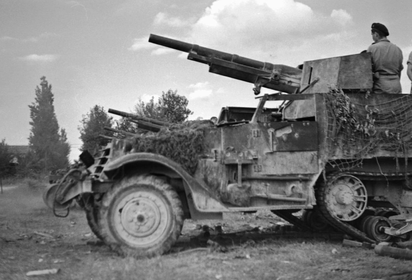 While engaged in the fighting at Anzio, Italy in April 1944, the First Special Service Force (FSSF) acquired a Gun Company from an American Ranger  unit, “Darby’s Rangers”.  This unit was equipped with four T30 Howitzer Motor Carriage halftracks equipped with a 75-mm M1897A4 howitzer, aka “French 75”, similar to the ones shown in this photo in service with the Canadian Army in Italy in 1944.