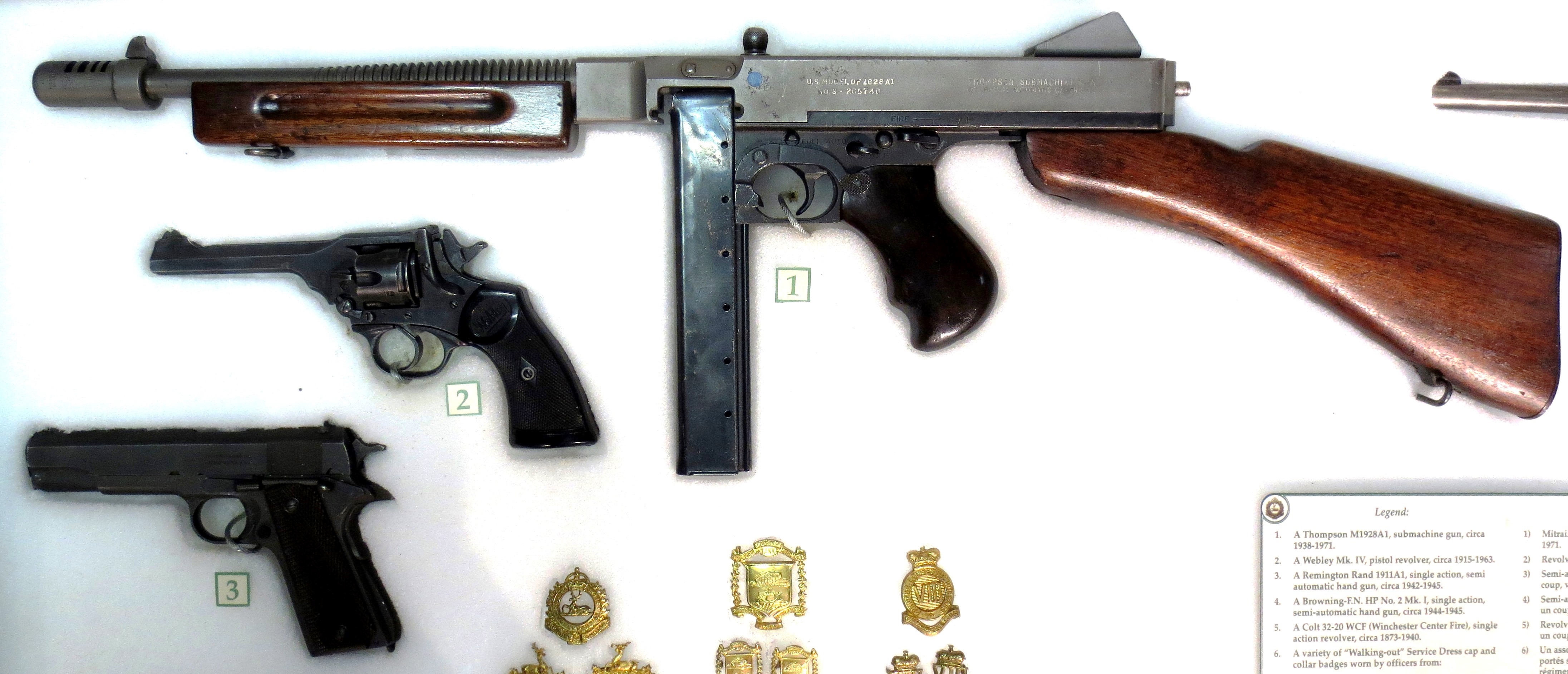 .45 calibre Thompson submachine gun (SMG), on display in the New Brunswick Military History Museum, 5 Canadian Division Support Base Gagetown, New Brunswick.  The M1928A1 had provisions for box and drum magazines. It had a Cutts compensator, cooling fins on the barrel, employed a delayed blowback action and its charging handle was on the top of the receiver.  Shown with a .45 cal Colt M1911 automatic pistol and a .455 cal Webley & Scott Mk. VI revolver.
