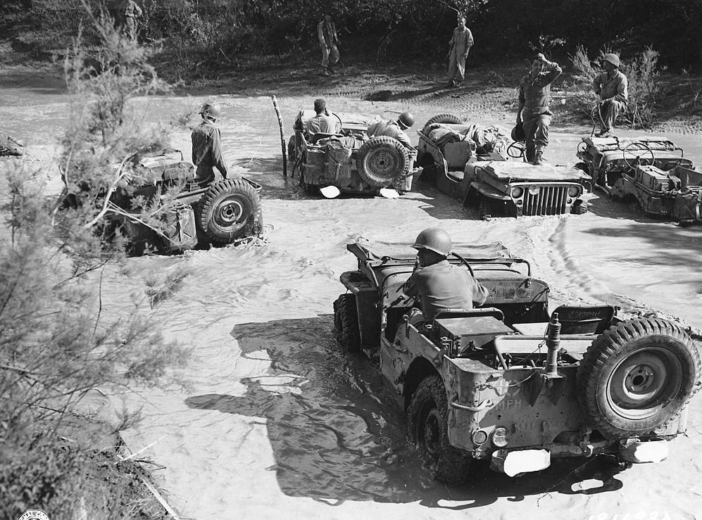 Fifth Army jeeps caught in a rain swollen stream.  Moments before the rain, the stream was only a few inches deep.  Volterra Sector, Italy, 9 July 1944.