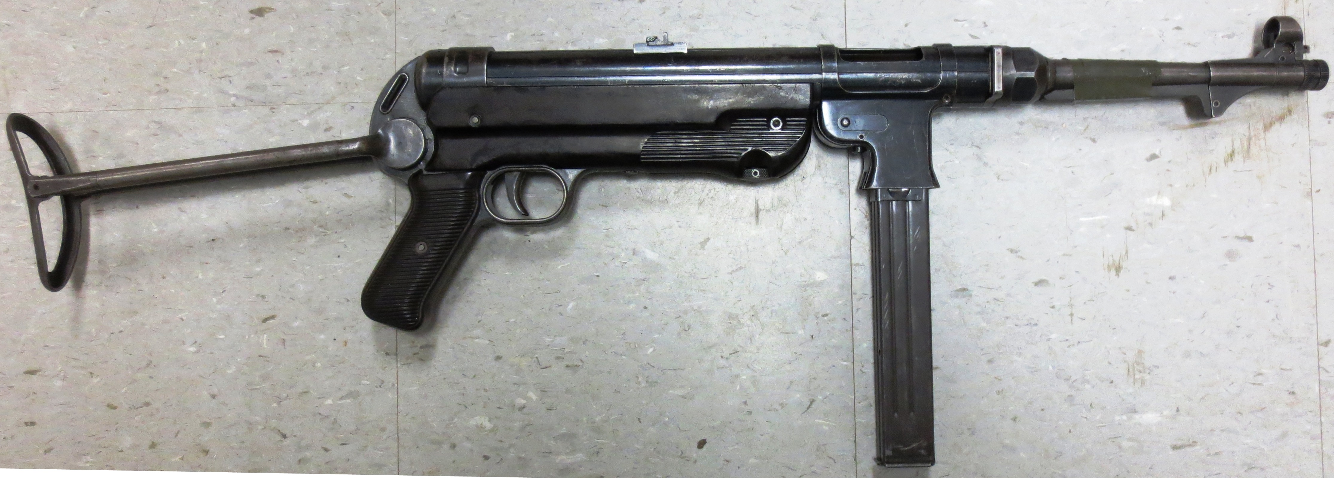 MP 40 (Maschinenpistole 40) 9-mm submachine gun (SMG), developed in Germany and used extensively by the Axis powers during the Second World War.  This one is on display in the Canadian Military Engineer Museum, 5 Canadian Division Support Base Gagetown, New Brunswick.