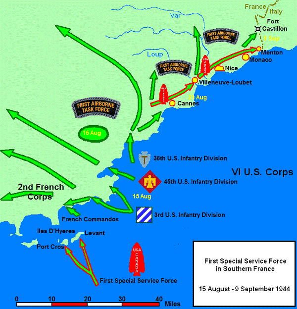 In August 1944, the Force was able to use its amphibious skills during the landings on islands flanking the invasion beaches in Southern France as part of Operation DRAGOON.  The unit then fell under the operational control of the 1st Airborne Task Force, clearing the French coastline east to the Italian border. It was their last major mission, and in December 1944, with the need for specialized forces waning, the Force was disbanded. The Canadians went largely to the 1st Canadian Parachute Battalion, the Americans to the 474th Infantry (Separate) Regiment, or to US parachute units.  The parachute-trained and combat tested Canadians of the FSSF were seen as a valuable asset for the 1st Canadian Parachute Battalion then training in England.